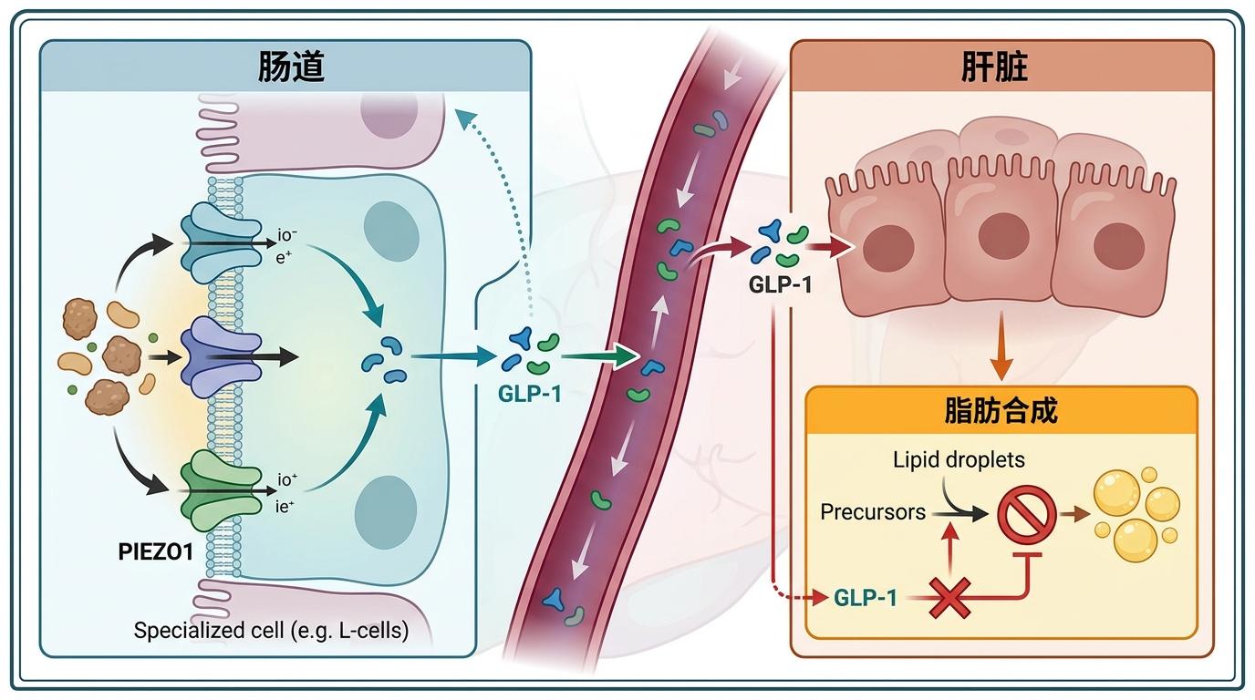 有意思的是,这个通路不仅在肝细胞里起作用。研究还发现,肠道里的PIEZO1能感知食物带来的机械刺激,促进GLP-1激素分泌,间接减少肝脏的脂肪合成——这意味着肝脏的脂肪调控,还和肠道的“机械感知”连在一起,形成了跨器官的代谢网络。
