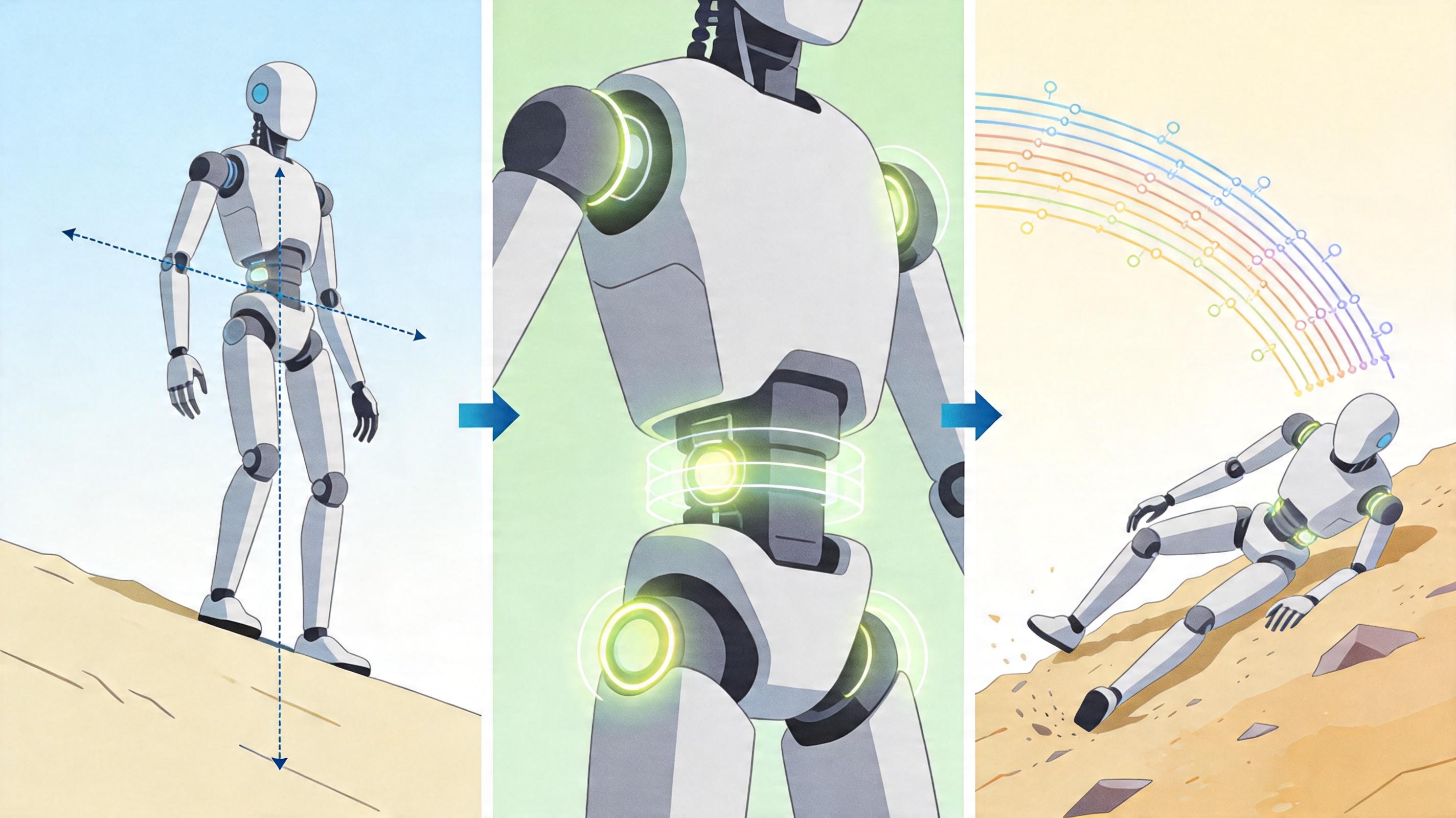 动态平衡,则是支撑机器人跑完全程的隐形骨架。不同于轮式机器人的天生稳定,双足人形机器人的每一步都像在控制一个高维倒立摆:要通过层级优化算法,把保持平衡这个最高优先级任务,拆解成20多个关节的力矩调整,哪怕地面有1度的倾斜,都要重新计算质心位置。为了抵消关节摩擦带来的误差,工程师们给机器人的关节加上了自适应补偿模型,就像给机械关节抹上了一层「智能润滑油」,让它在高速奔跑时不会因为卡顿摔倒。但赛道上还是随处可见机器人扑地的身影——当身体的惯性超过算法的响应速度,或是遇到未被训练过的地形扰动,再精密的控制也敌不过现实的意外。