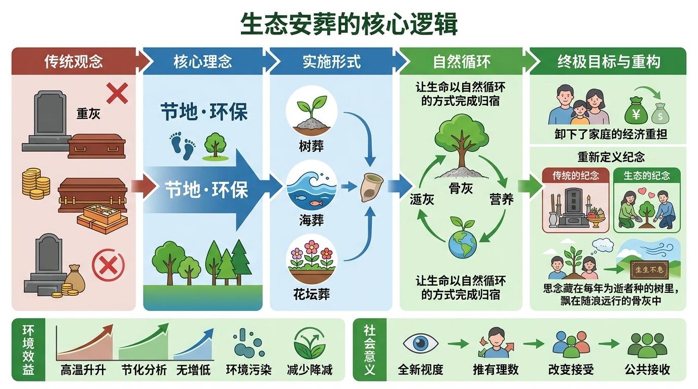 真正撬动这场变革的,是被越来越多人接纳的“生态安葬”——这绝非简单的安葬方式替换,而是对殡葬核心逻辑的重构。它以节地、环保为核心,树葬、海葬、花坛葬等形式,用可降解材料替代混凝土墓穴,让生命以自然循环的方式完成归宿,同时也卸下了家庭的经济重担。更关键的是,它重新定义了“纪念”:思念不必附着于高价土地,而是藏在每年为逝者种的树里,飘在随浪远行的骨灰中。