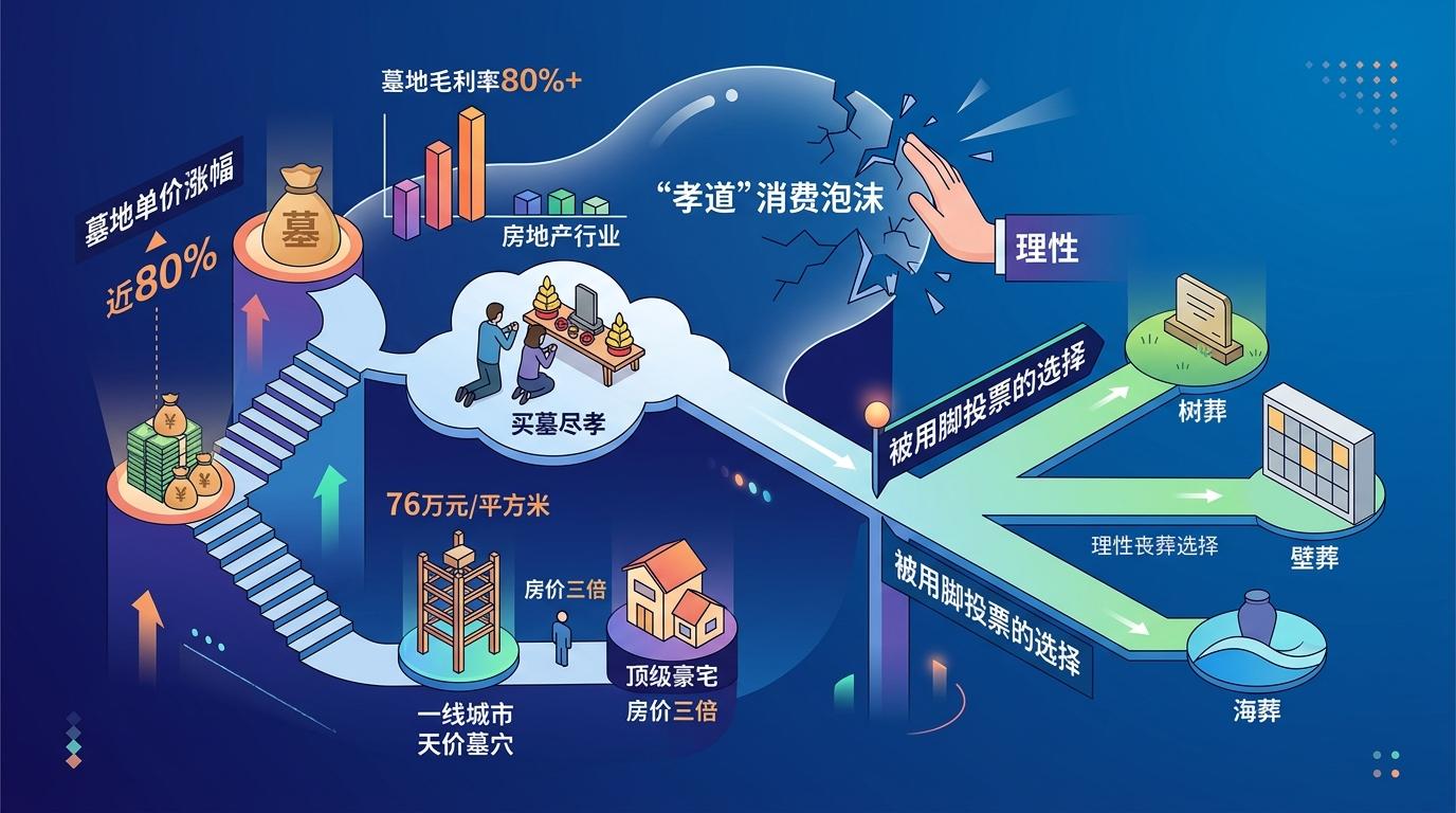 答案藏在那些被用脚投票的选择里。过去十年,部分墓地单价涨幅近80%,一线城市甚至出现76万元/平方米的天价墓穴,折合房价是顶级豪宅的三倍。当“事死如事生”的传统被异化为“买墓尽孝”的攀比,当墓地毛利率常年维持在80%以上、远超房地产行业,这场以“孝道”为名的消费泡沫,终于在理性面前破裂。