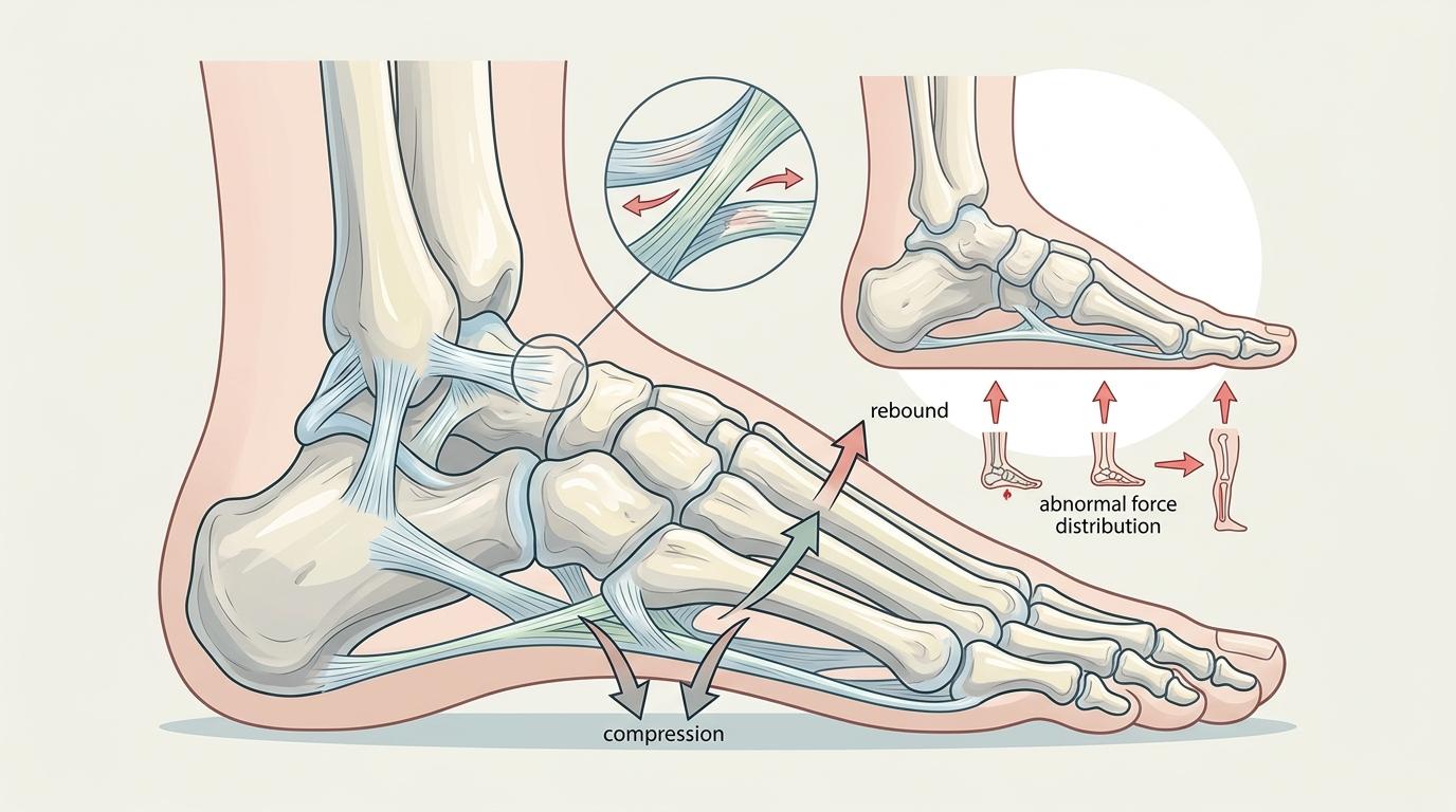 我们的脚底板从来不是一块平坦的地基。内侧纵弓、外侧纵弓与前足横弓组成的三维结构,是人体自带的避震器与动力杠杆:走路时它像弹簧一样压缩回弹,把地面冲击力消解在脚踝之前,同时储存能量推动身体向前。但足弓要到10岁才会完全成型,一旦因遗传、肥胖、过度劳损或衰老塌陷,整个下半身的力学链条就会像脱轨的齿轮一样全线跑偏。