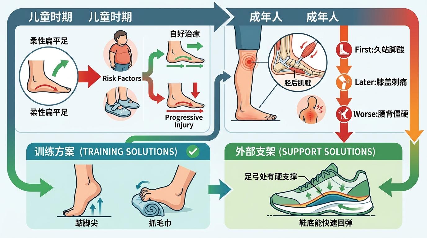 更值得警惕的是,扁平足的伤害是渐进式的。儿童时期的柔性扁平足大多会随发育自愈,但肥胖、长期穿无支撑软底鞋的孩子,足弓发育会被提前拖累;成年人的扁平足则常伴随胫后肌腱功能衰退,从最初的久站脚酸,到后来的膝盖刺痛、腰背僵硬,症状只会越来越重。但它并非不可逆转——踮脚尖、抓毛巾等简单的足底肌肉训练,能强化足弓的支撑力量;一双足弓处有硬支撑、鞋底能快速回弹的鞋,能帮塌陷的足弓分担一半压力。