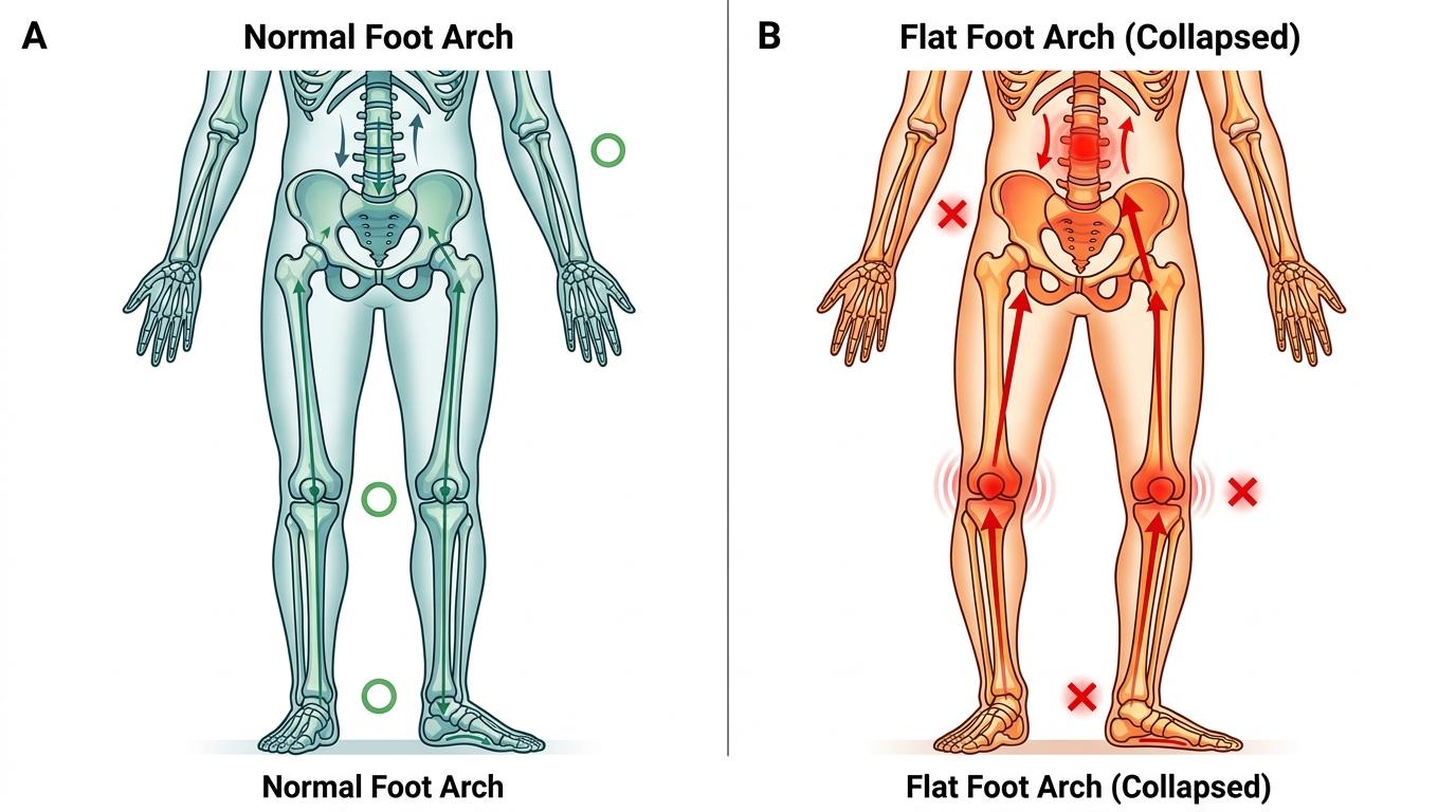 当你对着镜子掰正前倾的骨盆、绷紧酸胀的腰背时,绝不会想到问题的根源,可能在那双被鞋裹住的脚底板里。你花了无数时间练天鹅颈、直角肩,却忽略了这副身体最底层的承重结构——足弓。每六个扁平足患者里,就有四个被慢性腰痛纠缠,这个比例是正常足弓人群的4.5倍,可大多数人直到膝盖变形、走路发颤,才会低头看一眼自己的脚。