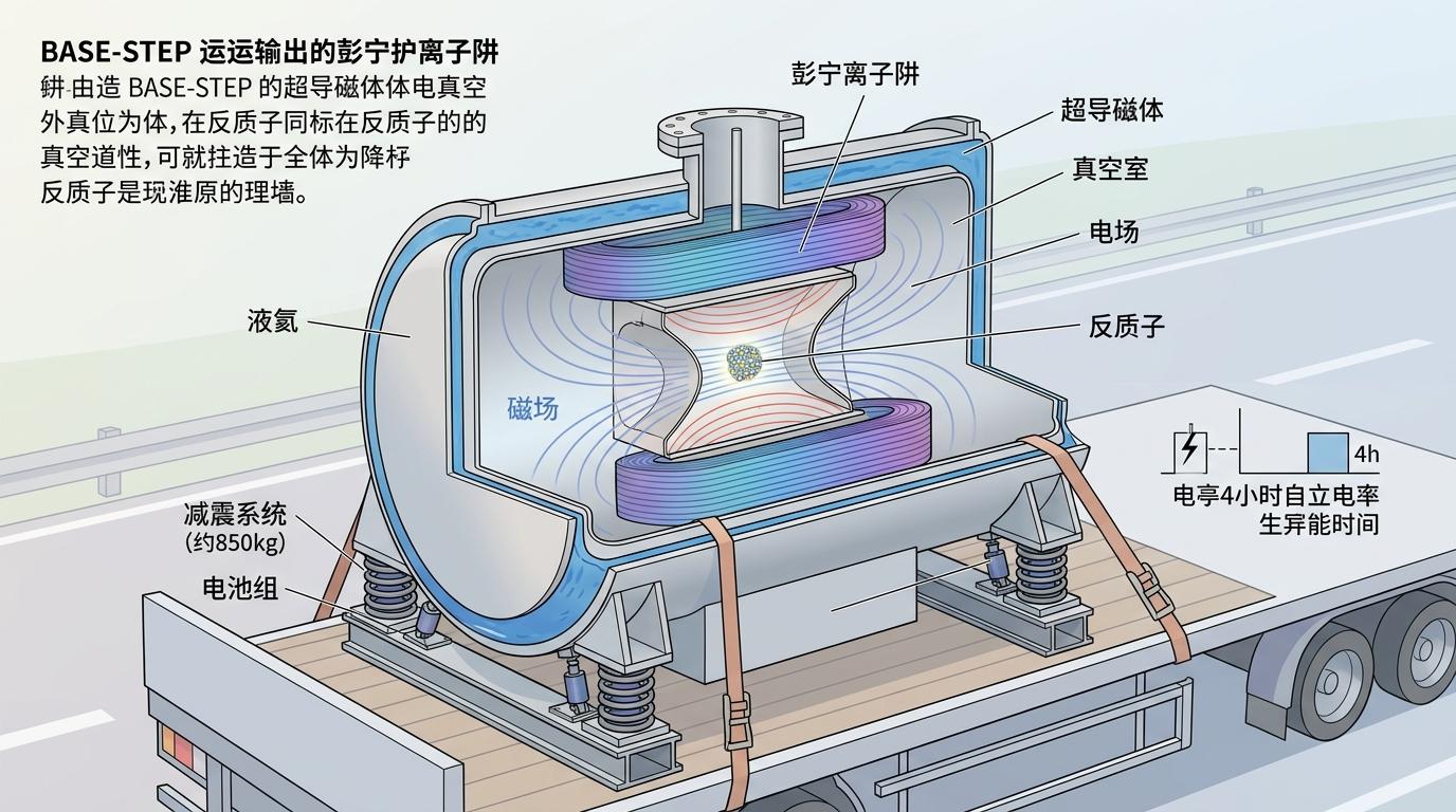 保护反质子的秘密,藏在那个叫BASE-STEP的“移动笼子”里。这本质上是一个便携式彭宁离子阱,说穿了就是用磁场和电场织成的无形网:先把容器抽成比星际空间还空的超高真空,再用超导磁体造出强磁场,把带负电的反质子牢牢“锁”在容器中央,让它们碰不到任何物质壁面。为了应对公路上的颠簸和震动,这个850公斤的装置还装了多重减震设计和独立电池组,就算断电也能靠液氦维持超低温,让超导磁体稳定工作4小时。