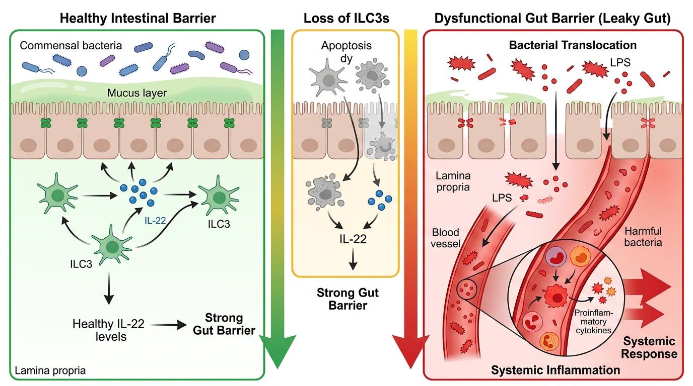 ILC3s的死亡只是第一步。当这些“保安”消失,肠道屏障的“加固剂”IL-22随之锐减,肠上皮细胞的紧密连接开始松动,黏液层变薄,肠道通透性增加——也就是俗称的“肠漏”。此时,肠道里的有害菌和它们的代谢产物(比如脂多糖LPS)会趁机穿过肠壁进入血液循环,激活全身的炎症反应。