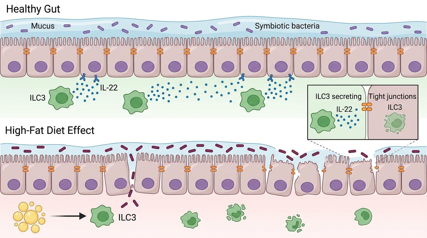 ILC3s是肠道里的“常驻保安”,它们不需要后天激活,从出生起就守在肠壁黏膜上,靠分泌IL-22维持肠道屏障的完整性——这种细胞因子能督促肠上皮细胞产生黏液、加固紧密连接,还能直接抑制有害菌扩张。但麻省总医院的研究团队发现,高脂饮食对它们的攻击精准又迅速:只要连续几天喂食高脂饲料,小鼠肠道里的ILC3s数量就会骤降,而这和热量过剩、体重增加完全无关,是脂肪本身触发的“定向清除”。