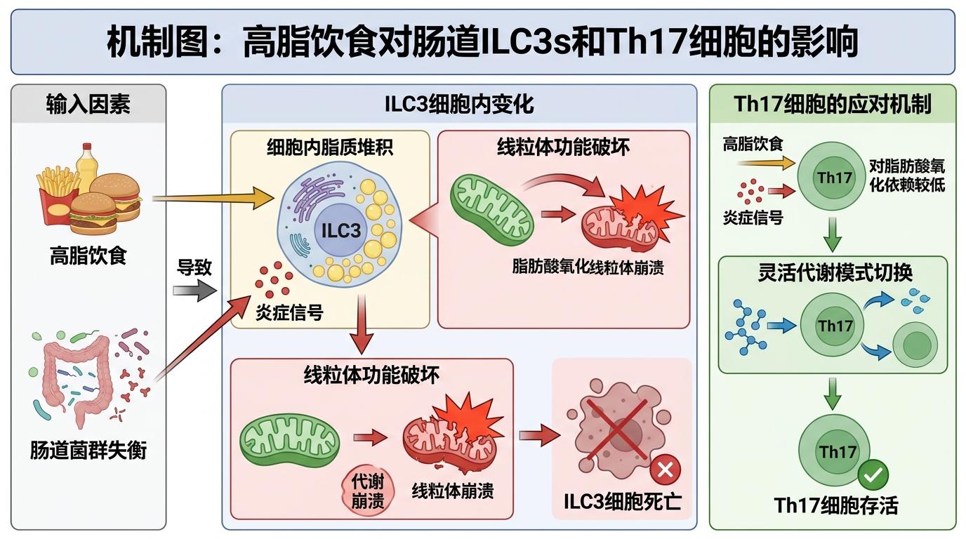 更耐人寻味的是,和ILC3s功能相近的Th17细胞却几乎不受影响。原来,ILC3s的能量代谢高度依赖脂肪酸氧化,高脂饮食会让它们的细胞内脂质过度堆积,再加上肠道菌群失衡引发的炎症信号,直接破坏线粒体功能——就像给细胞的“发电站”浇了一盆油,最终导致ILC3s因代谢崩溃而死亡。而Th17细胞能切换代谢模式应对压力,这才躲过一劫。