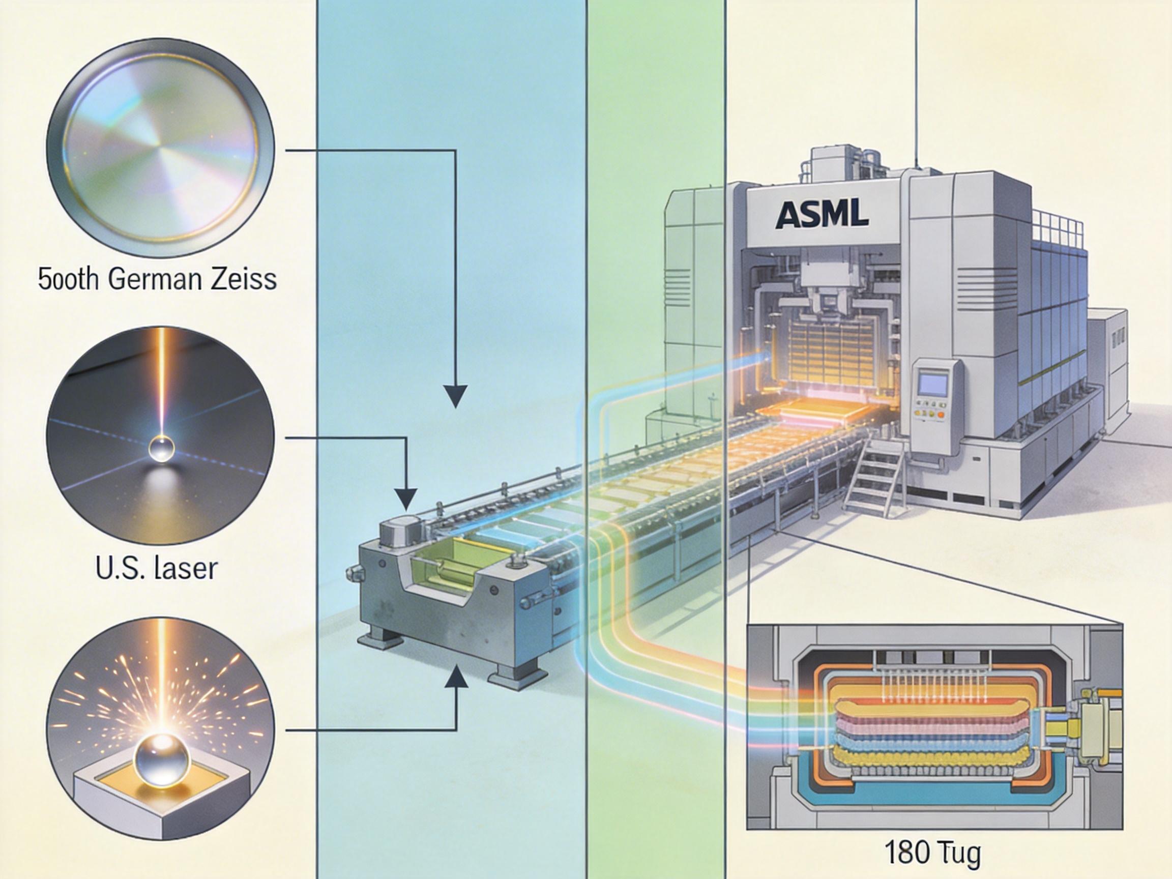 制造这样一台机器,需要全球5000多家供应商的协作:德国蔡司提供的反射镜,表面精度达到0.1纳米,相当于把地球表面磨平到只剩1米的起伏;美国的激光器每秒能发射50000次脉冲,精准轰击直径25微米的锡液滴,产生能发出极紫外光的等离子体;荷兰ASML则负责把10万个零件组装成一台重达180吨的庞然大物。
