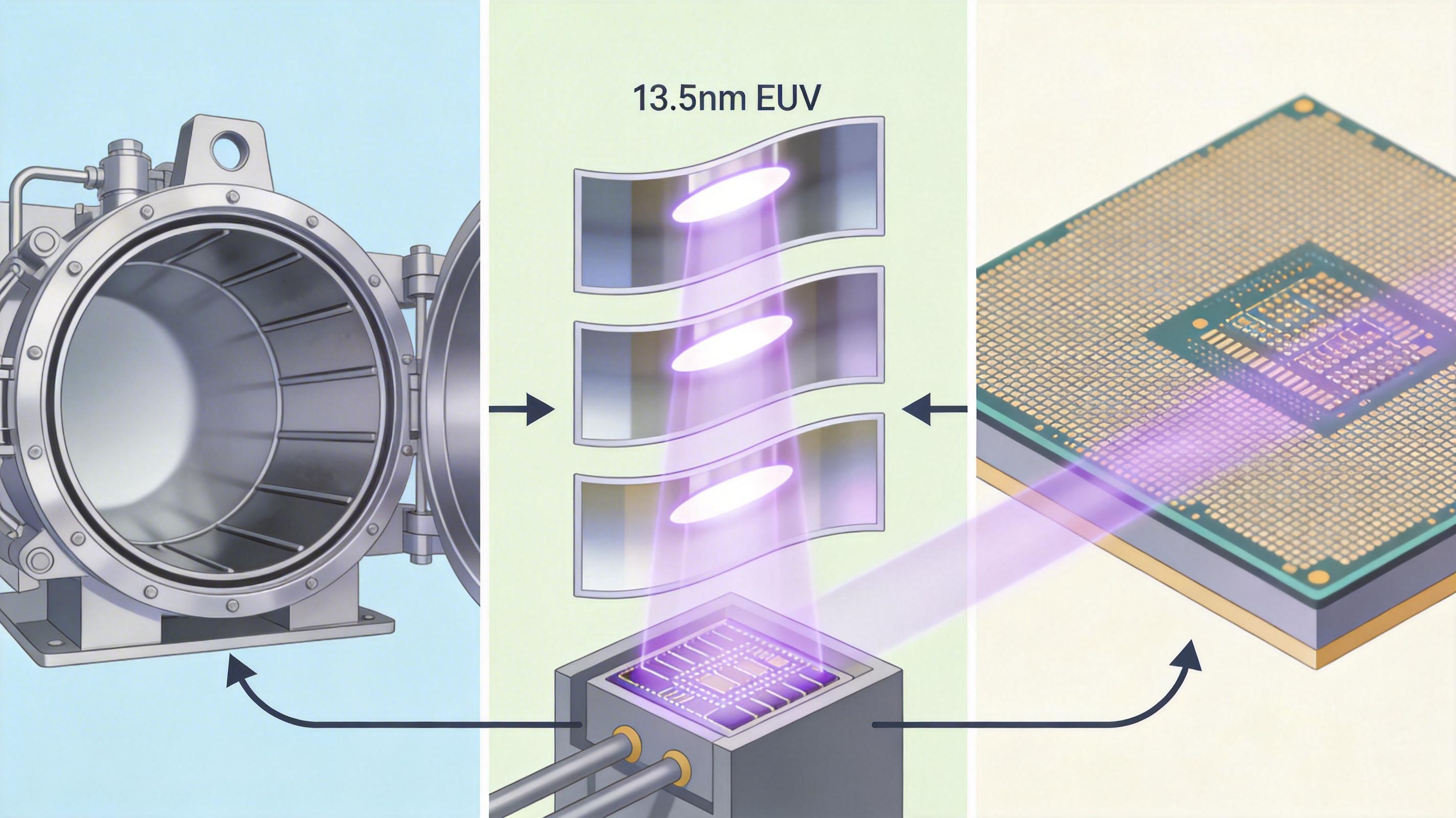 你可以把EUV光刻机想象成一台超精密的"芯片打印机",但它的复杂程度远超任何工业设备。它用13.5纳米波长的极紫外光——比紫外线短10倍——在硅片上蚀刻电路,而这种光根本无法穿透空气和玻璃,只能在真空环境中通过多层反射镜传递。