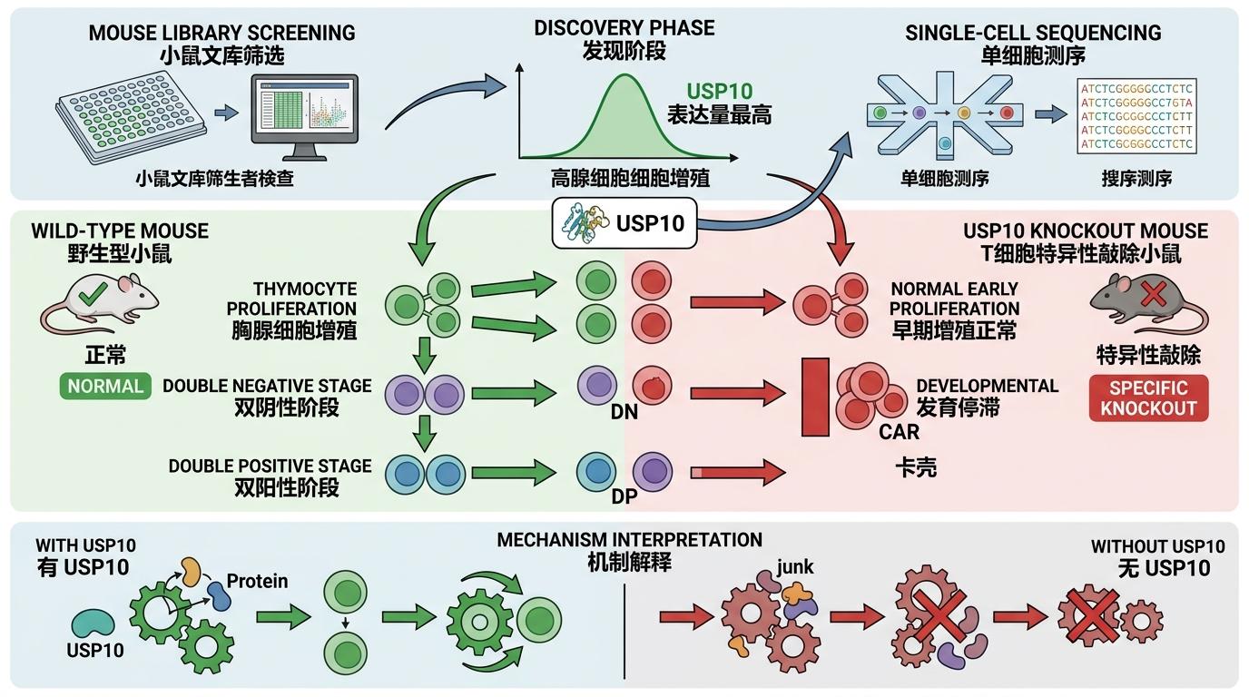 团队通过小鼠文库筛选和单细胞测序发现,USP10在胸腺细胞的增殖高峰期表达量最高。如果把T细胞里的USP10特异性敲除,小鼠胸腺细胞的增殖和分化会直接「卡壳」——本该从双阴性阶段(既不表达CD4也不表达CD8)推进到双阳性阶段的细胞,大多停在了半路。