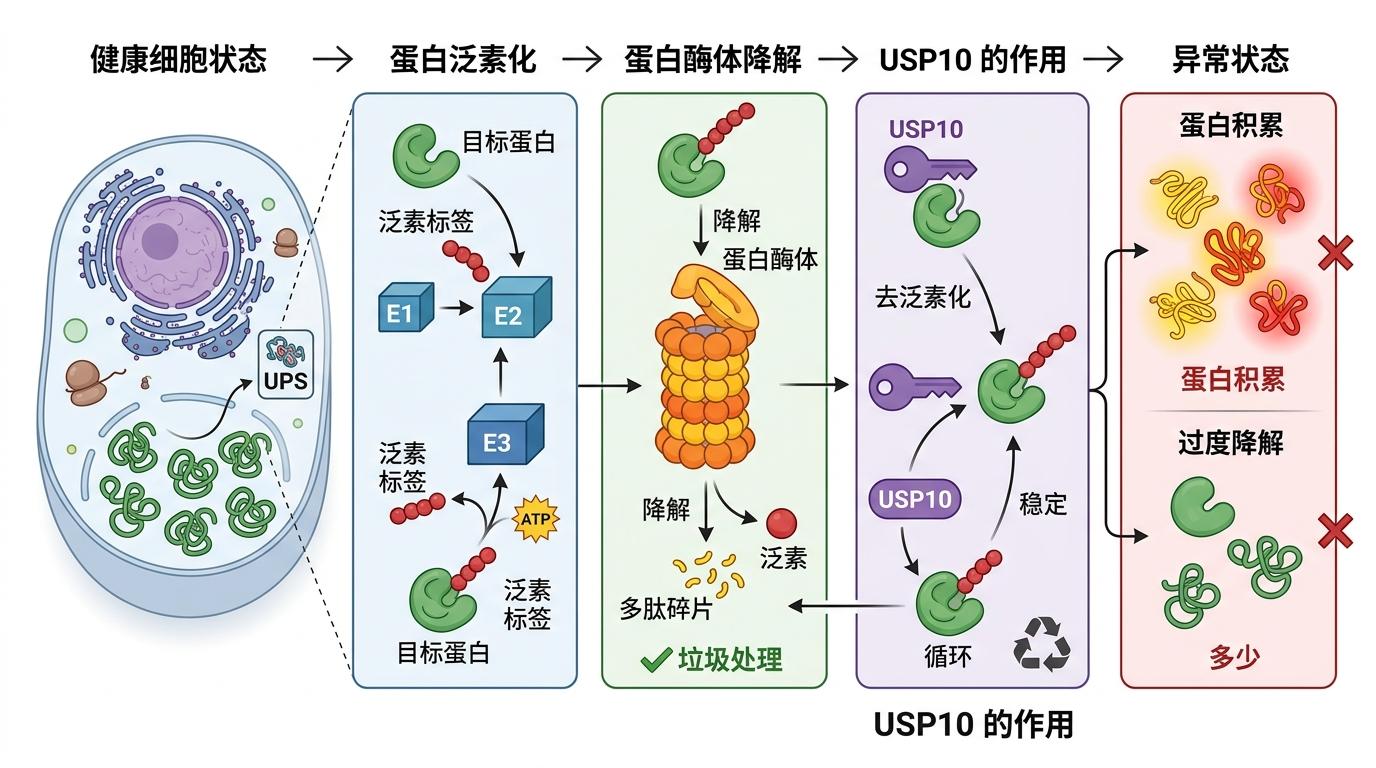 要理解USP10的作用,得先认识细胞里的「垃圾处理系统」——泛素-蛋白酶体系统(UPS)。简单说,就是给要被降解的蛋白贴个「泛素标签」,蛋白酶体看到标签就会把蛋白拆成碎片,维持细胞内的蛋白平衡。