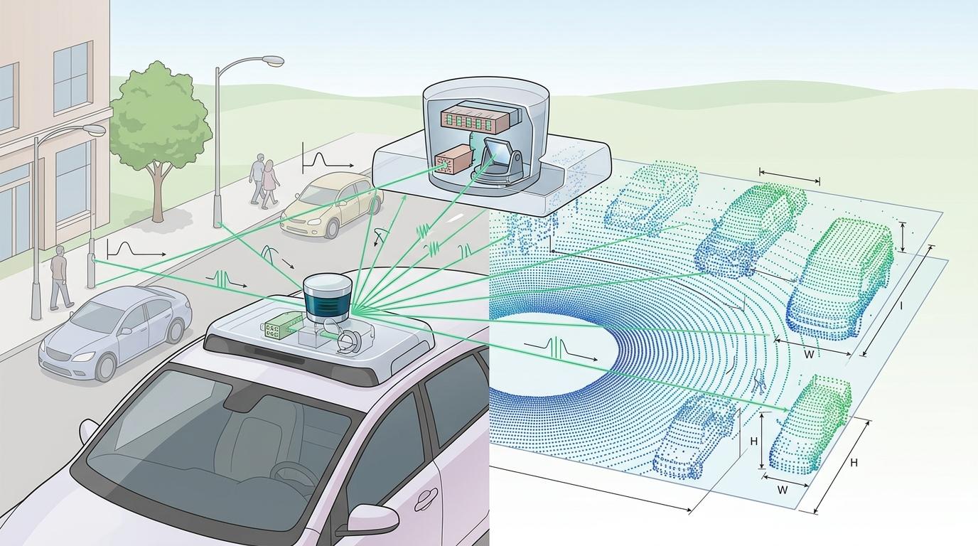 你可以把激光雷达想象成一台每秒发射数百万次的“激光手电筒”——每一束激光碰到物体就会反射回来,通过计算往返时间,就能算出物体的距离,无数个这样的点连起来,就拼成了车辆周围的三维“点云地图”。和摄像头的“平面拍照”不同,它能精准测出每个物体的大小、距离和移动速度,哪怕是夜间、暴雨天也能稳定工作。