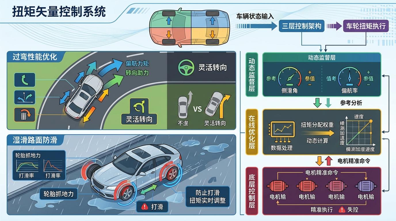 这带来的改变是颠覆性的:过弯时,它能给外侧车轮加扭矩、内侧车轮减扭矩,产生一个“转向助力”的偏航力矩,让车辆像猫一样灵活;在湿滑路面上,它能实时调整每个车轮的扭矩,防止打滑。工程师们甚至设计了三层控制架构:动态监督层盯着车辆的侧滑角和偏航率,在线优化层实时调整扭矩分配权重,底层控制层精准执行每个电机的命令,确保车辆在极限工况下也不会失控。