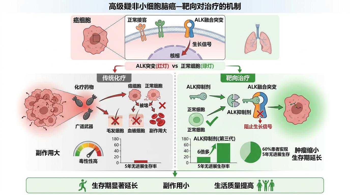 这不是奇迹,是靶向治疗重构的晚期肺癌生存图景。ALK融合突变,这个在非小细胞肺癌里仅占3%-7%的“钻石靶点”,就像癌细胞身上独有的钥匙孔——靶向药精准插进这个孔洞,卡住肿瘤生长的信号通路,却不会误伤正常细胞。和传统化疗那种“杀敌一千自损八百”的狂轰滥炸不同,它更像精准的狙击手,只盯着癌细胞的致命弱点开火。杰弗里·陶吃的第三代ALK抑制剂,已经能让60%的患者实现5年无进展生存,这个数字是传统化疗的6倍还多。