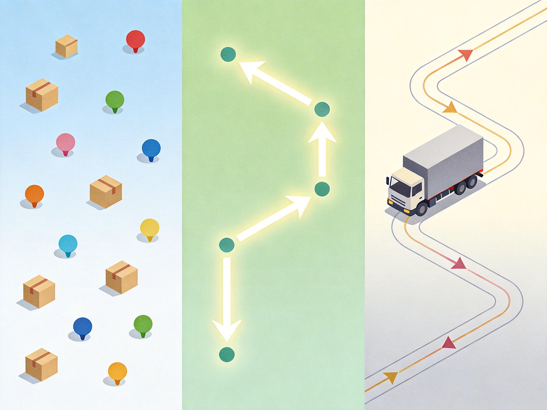 第一题,先给卡车画路线。他们用「扩展最小边际成本算法」,把所有带优先级的订单串成一条严格按顺序走的卡车路线——就像先给服务员排好「先给3号桌上前菜,再给5号桌上汤」的固定流程,确保规矩不被打破。