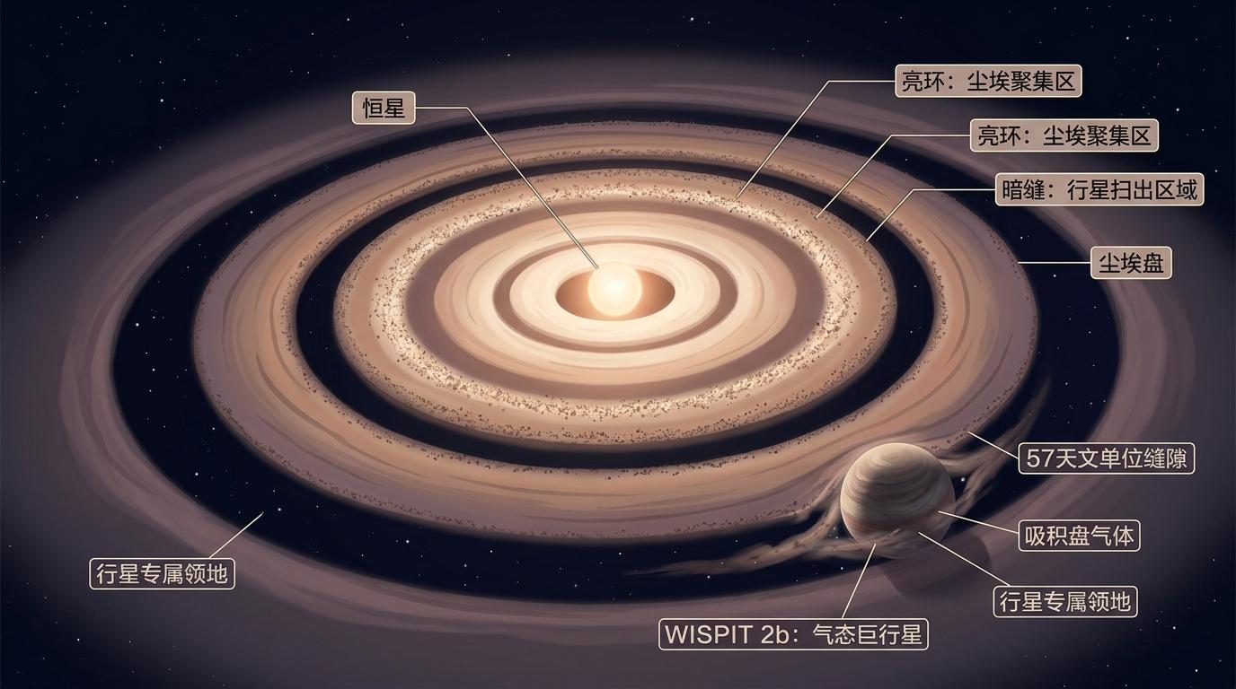 WISPIT 2的尘埃盘像一张摊开的唱片,上面刻着至少四条明暗交替的环带——亮环是尘埃聚集区,暗缝则是行星用引力“扫”出来的专属领地。2025年,天文学家首先在外侧57天文单位的缝隙里找到了WISPIT 2b:这颗质量是木星4.9倍的气态巨行星,正以10倍日木距离的轨道绕着恒星旋转,还在不断吸积盘里的气体长大。