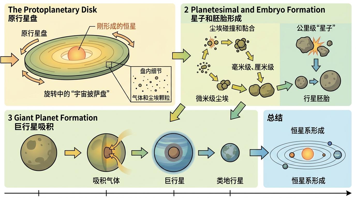 要理解这两颗行星的意义,得先搞懂它们的“产房”——原行星盘。你可以把它想象成一个旋转的“宇宙披萨盘”:中心是刚形成的恒星,盘里充满了气体和尘埃颗粒。这些颗粒就像披萨上的配料,在旋转中不断碰撞、黏合,从微米级的尘埃长成公里级的“星子”,再聚合成行星胚胎,最后吸积气体变成巨行星。