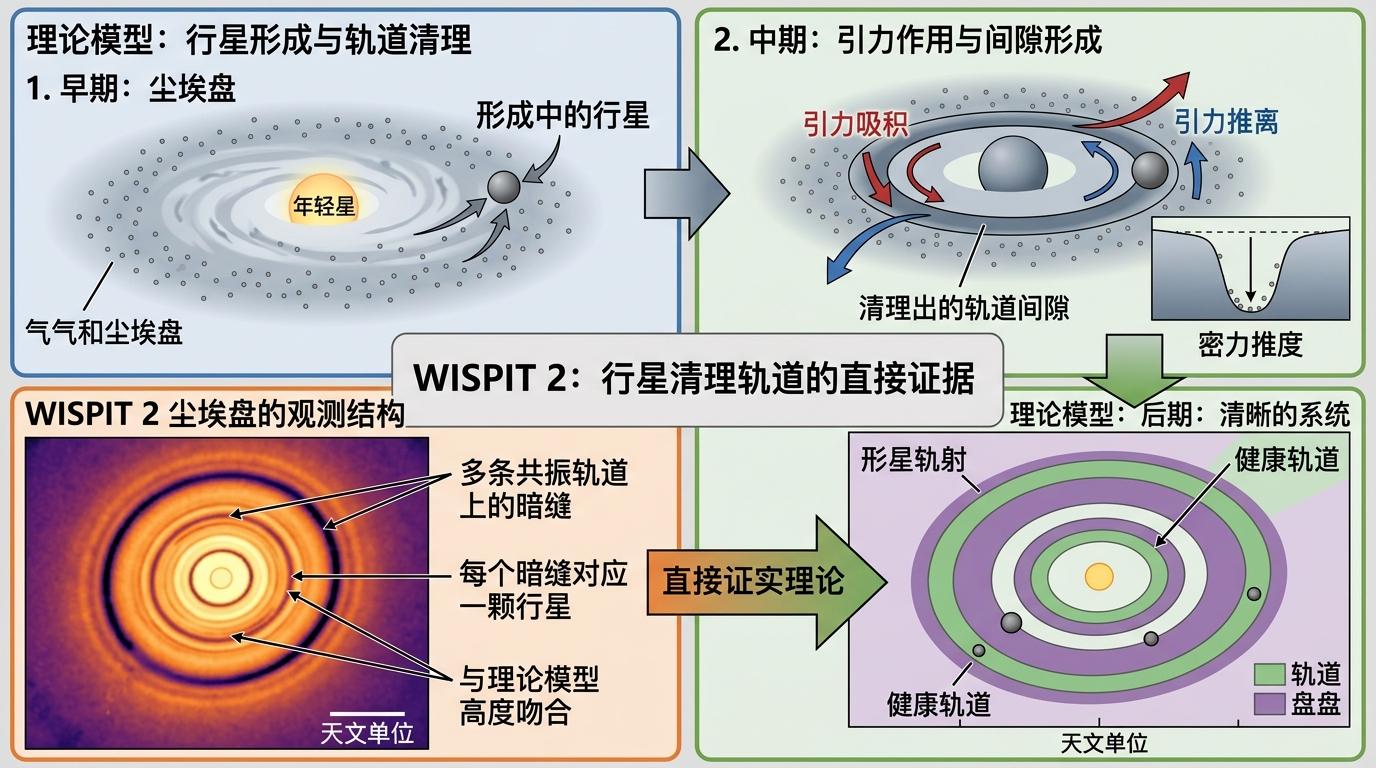但这个过程一直是理论模型里的场景,直到WISPIT 2的出现。它的尘埃盘里,每条暗缝都精准对应着一颗行星的轨道——这直接证实了“行星清理轨道”的理论:当行星长到足够大,它的引力会把轨道上的尘埃和气体要么吸进自己体内,要么推到轨道外侧,最终在盘里清出一条缝隙。
