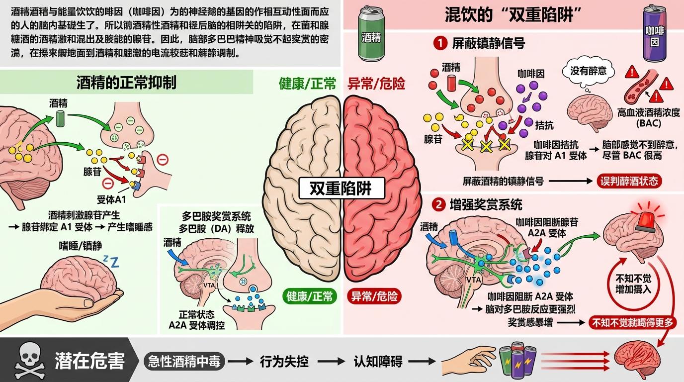 这背后的神经机制藏着双重陷阱。酒精本是中枢神经抑制剂,会通过增加脑内腺苷浓度让人镇静嗜睡;而能量饮料里的咖啡因是腺苷受体拮抗剂,能直接「屏蔽」酒精的镇静信号,让你误以为自己没醉,实则血液酒精浓度丝毫未降。更危险的是,咖啡因会通过阻断腺苷A2A受体,增强酒精对多巴胺奖赏系统的刺激——大脑会把「混饮」和「愉悦感」绑定,不知不觉就喝得更多。