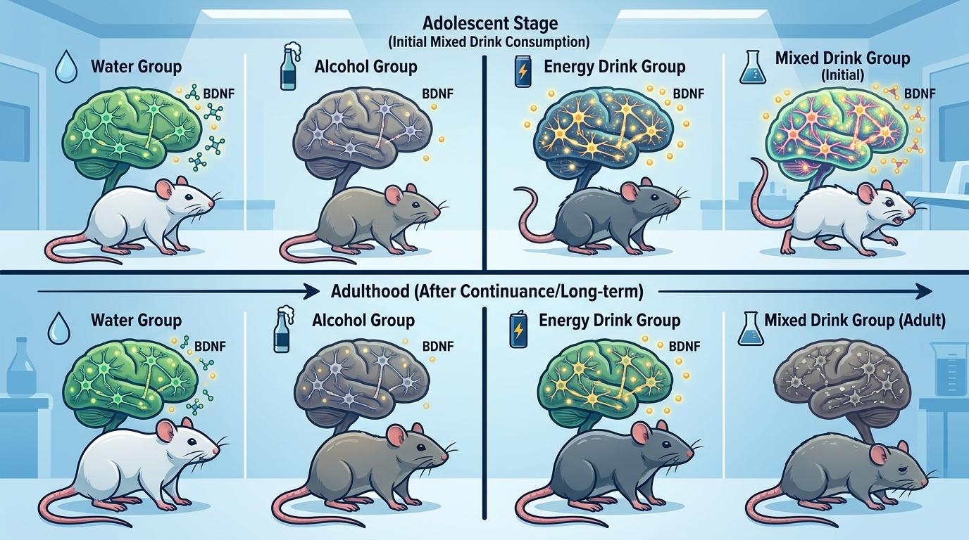 凌晨两点的写字楼茶水间,有人灌下一口冰啤酒压下疲惫,有人开罐能量饮料试图续上精力,还有人把两者兑在一起——以为能凑出「清醒的尽兴」。但意大利卡利亚里大学的大鼠实验给出了残酷的答案:这种「爽感」是大脑的骗局,留下的损伤可能从青春期延续到成年。
