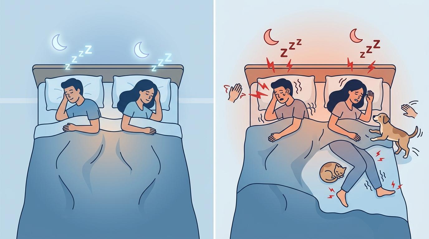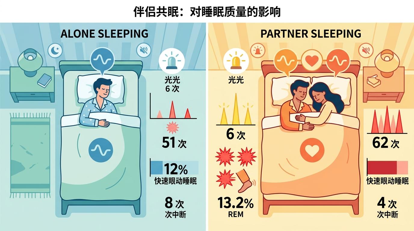 你有没有过这种体验:明明夜里被伴侣的翻身、拽被子弄醒好几次,第二天却笃定自己睡了个好觉。最新的睡眠研究给了这个矛盾最精准的答案——不是你的记忆出了错,是共眠悄悄重塑了你的睡眠结构。