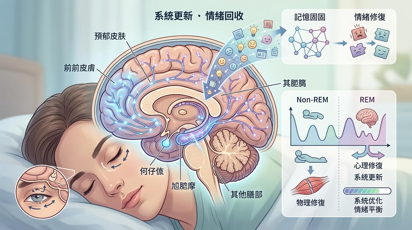REM睡眠是什么?它是大脑的「情绪回收站」——眼球快速转动时,大脑正忙着整理白天的情绪碎片、巩固记忆,甚至悄悄修复心理压力。把睡眠比作一场夜间检修,非REM睡眠是给身体换机油,REM睡眠就是给大脑做系统更新。伴侣共眠时,这场更新不仅时间更长,还更少被打断。