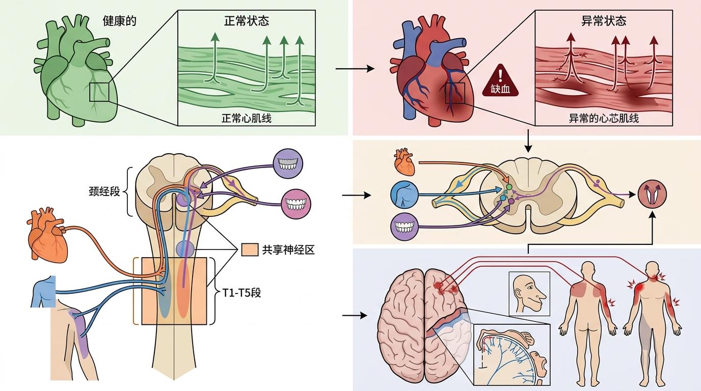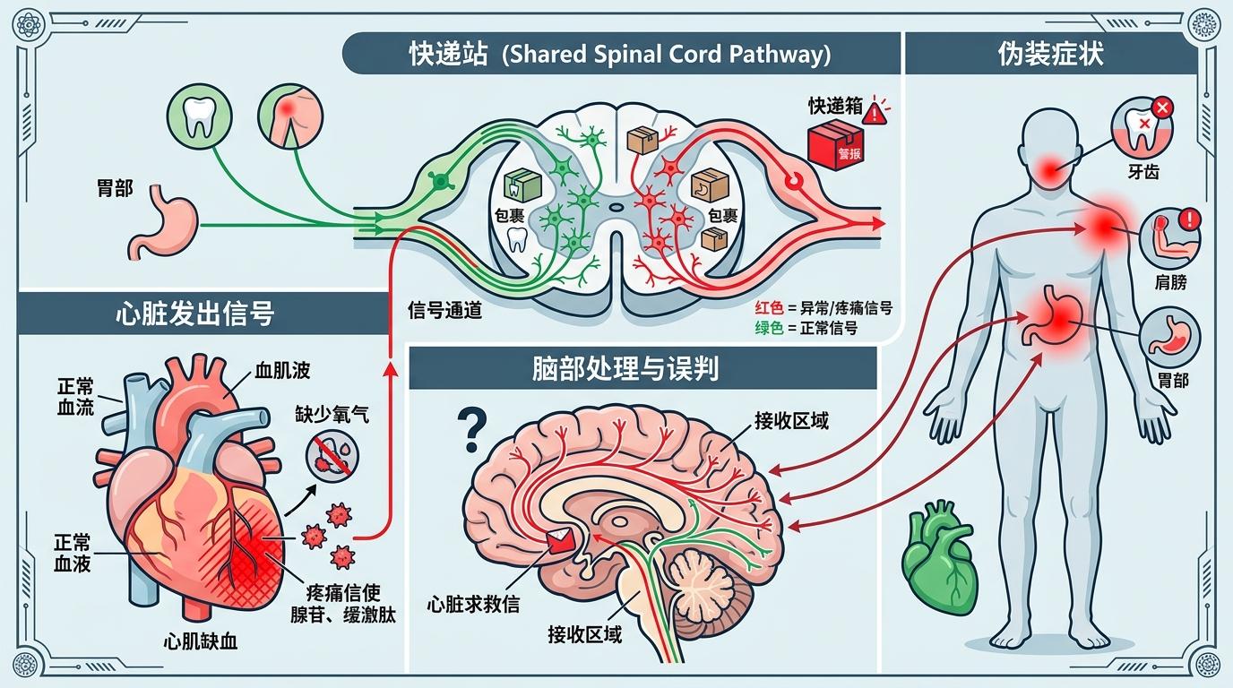 要理解这种“伪装”,得先搞懂**牵涉痛**——这是心脏发出“假情报”的核心机制。你可以把脊髓想象成一个共享快递站,心脏的感觉神经和牙齿、肩膀、胃部的感觉神经,都在这里寄取信号。当心肌缺血缺氧时,会释放出腺苷、缓激肽这些“疼痛信使”,本应通过交感神经精准传递到大脑的“心脏求救信”,却因为神经信号在快递站里挤成一团,被大脑错当成了来自牙齿、肩膀的包裹。