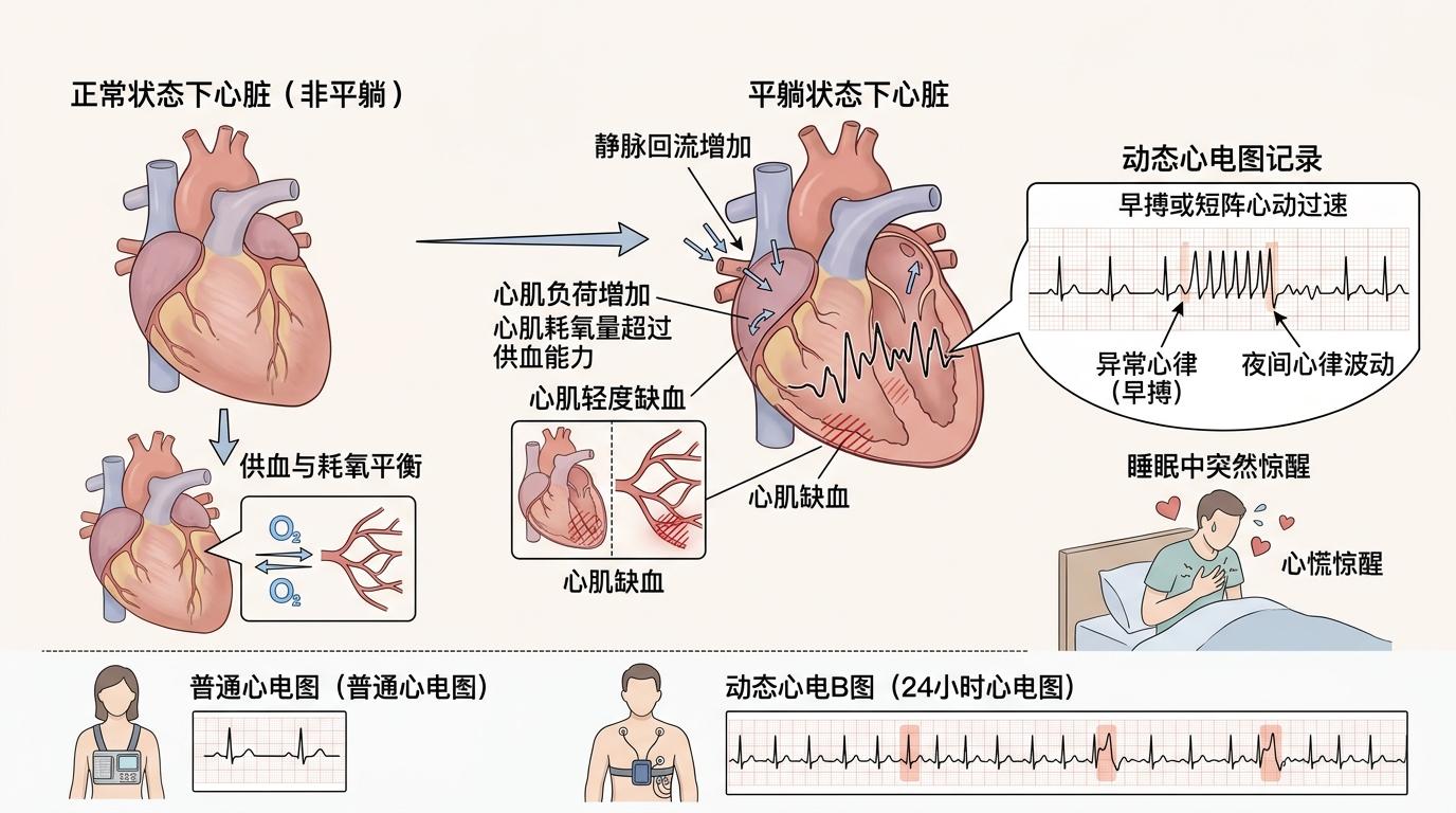 夜间反复惊醒——不是所有失眠都该怪压力。当人平躺时,静脉回流到心脏的血液量会增加30%以上,相当于给心脏额外压了一袋重物。对于已经心功能减退的人来说,这会让心肌的耗氧量瞬间超过供血能力,触发轻度缺血。此时心脏可能会出现早搏或短阵心动过速,人会在睡梦中突然心慌惊醒,却完全想不到是心脏出了问题。这时普通心电图根本抓不到异常,只有**动态心电图(24小时心电图)**能像“卧底”一样,记录下睡眠时的心律波动——它能捕捉到普通心电图错过的90%以上的夜间心脏异常。