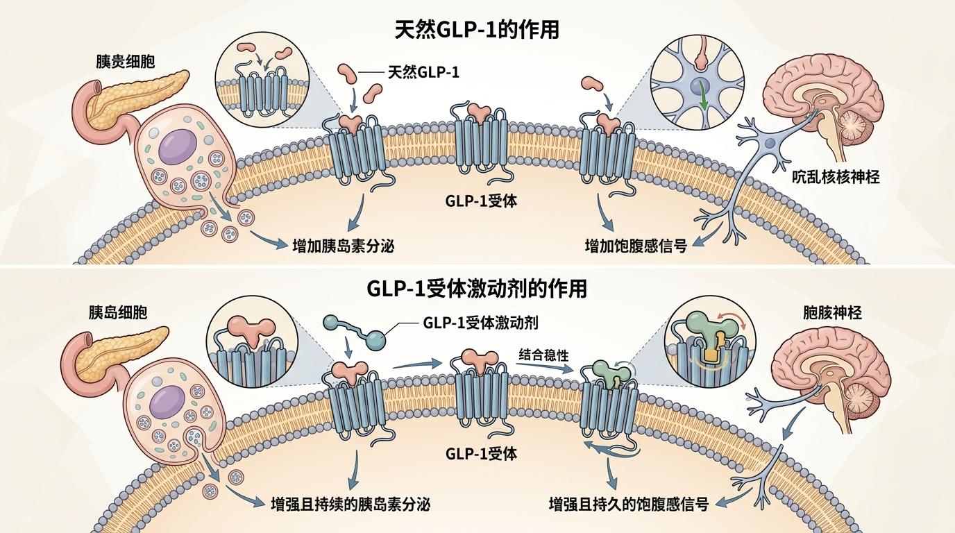 要理解基因的作用,得先搞懂GLP-1受体激动剂到底是什么——你可以把它想象成一把钥匙,专门打开肠道和大脑里的“食欲锁”:进食后肠道会分泌GLP-1激素,它能让胰腺多分泌胰岛素,还能给大脑发信号“别吃了”。而这类药物就是人工合成的“超级钥匙”,能牢牢卡在锁孔里,持续发挥作用。