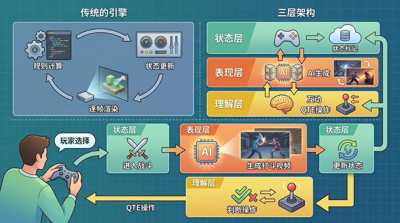 而三层架构换了个思路:不跟传统引擎比“模拟真实世界”,而是把视频从“看的内容”变成“玩的载体”。传统引擎是“规则→状态→渲染”,每一帧都要按规则计算;这套架构是“状态→AI生成→互动”,视频不用理解规则,只需要在特定状态下输出对应内容。比如玩家选择“和NPC打架”,状态层标记“进入战斗”,表现层就生成一段打斗视频,理解层负责判断玩家的QTE操作是否成功,再更新状态。