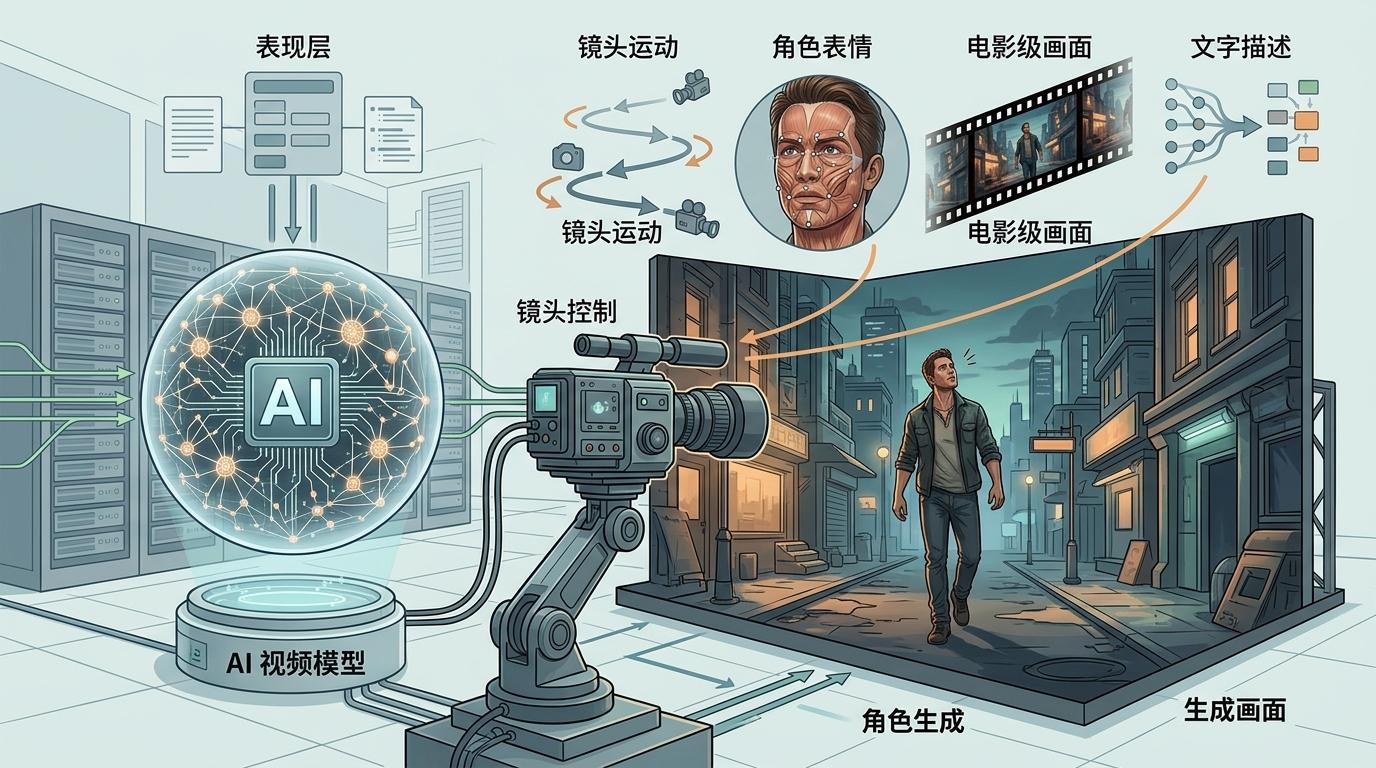 你可以把这套架构想象成一家分工明确的影视公司: 表现层是负责拍片子的导演和摄制组——用AI视频模型生成电影级画面、镜头运动、角色表情,把文字描述变成玩家能“看进去”的场景。这是AI最擅长的部分,不用再让它硬扛逻辑,只需要专注“好看”。