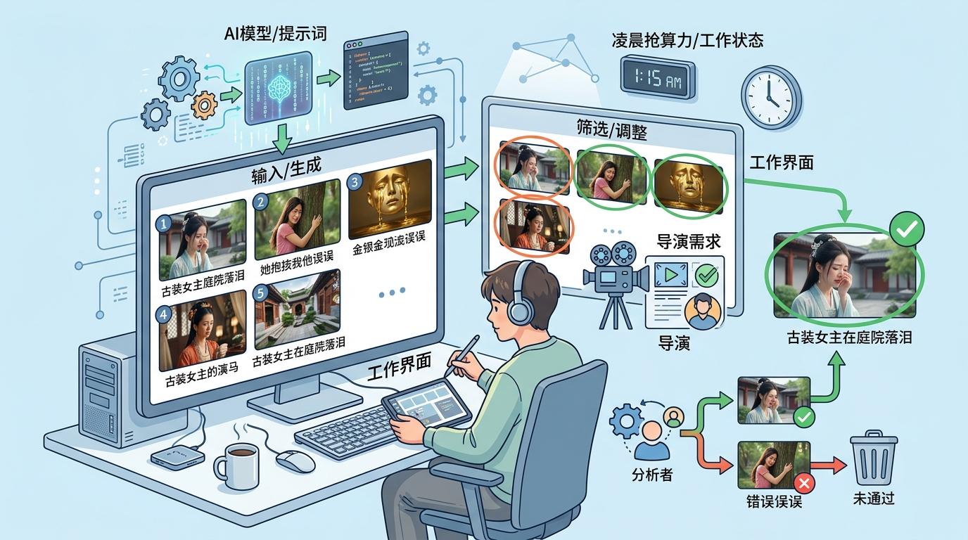 抽卡师的诞生,本质是给当前AI的「不靠谱」填坑。现在的AI视频生成,还像开盲盒:你输入「古装女主在庭院落泪」,它可能给你变出女主抱着庭院哭,或是眼泪变成金色瀑布。抽卡师的工作,就是把这些随机产出的「盲盒」,筛选、调整成符合导演要求的素材。他们不需要专业背景,只要会用提示词,甚至爱看短剧就能上岗——月薪从两千到六千,大小周是常态,凌晨抢算力是行业潜规则。