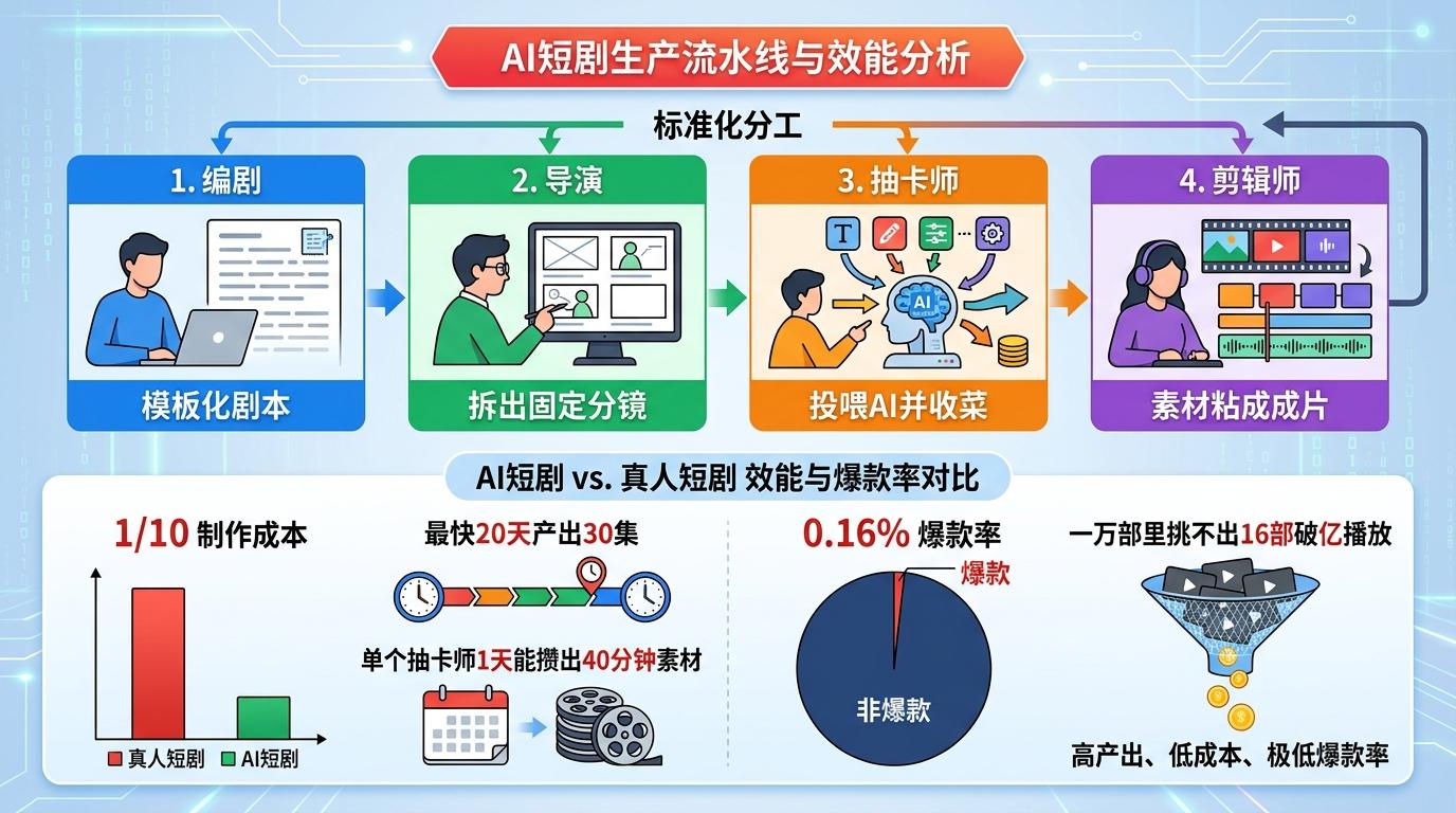 这背后是AI短剧生产流水线的核心逻辑:用标准化分工消解技术门槛。编剧出模板化剧本,导演拆出固定分镜,抽卡师负责「投喂」AI并收菜,最后由剪辑师把素材粘成成片。整个流程像组装手机,每个环节都不需要太多创造性,只要重复操作就能完成。数据显示,AI短剧的制作成本只有真人短剧的十分之一,最快20天就能产出30集,单个抽卡师一天能攒出40分钟素材——但爆款率只有0.16%,一万部里挑不出16部能破亿播放的。