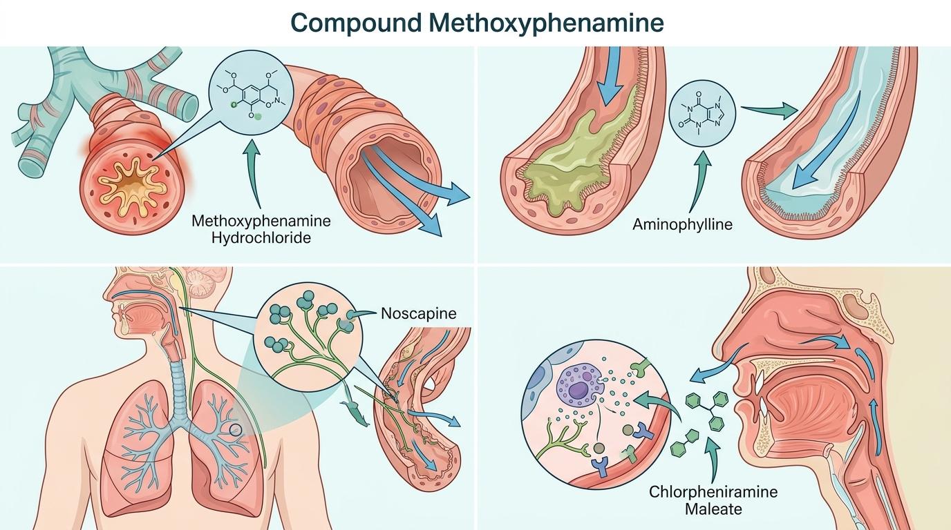 复方甲氧那明更像个「多人救火队」——一盒药里装了四个各司其职的成分:盐酸甲氧那明负责把痉挛的气管「掰直」,让你能顺畅喘气;那可丁是直接堵死咳嗽信号的「镇咳主力」;氨茶碱帮着消肿化痰,避免痰堵在气管里添乱;还有马来酸氯苯那敏,专门对付过敏引起的鼻痒、流涕。
