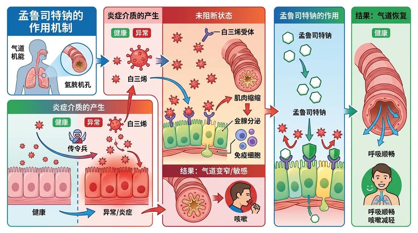 而孟鲁司特钠走的是「精准打击」路线。它不直接管咳嗽这件事,而是盯着一种叫「白三烯」的炎症介质——这东西就像气道里的「炎症传令兵」,会招来免疫细胞把气管堵得严严实实,还会让气管变得特别敏感,一点刺激就咳。孟鲁司特钠的作用,就是把这些「传令兵」的接收器给封死,让炎症信号传不出去。