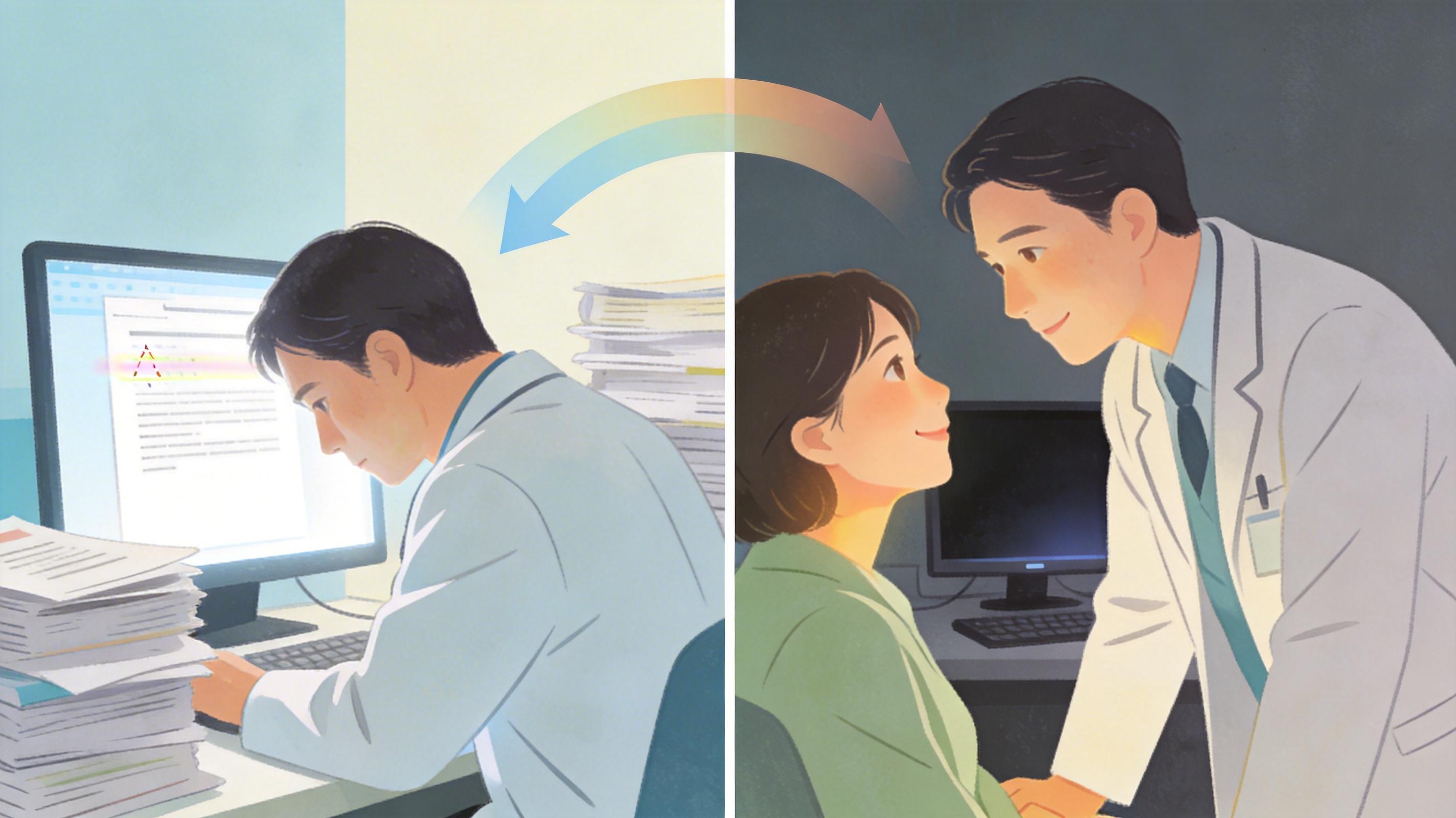 最先被AI解放的,是被文书压得喘不过气的医生。过去,一份出院小结可能要耗掉半小时的诊疗间隙,现在AI能在对话结束时自动生成初稿,把医生从屏幕前拉回病床边。克利夫兰诊所的实践显示,AI语音助理能让医生日均少花15分钟在文书上,80%的患者感觉到医生的眼神终于落在了自己身上,而非电脑屏幕。但这份解放有代价:AI生成的内容可能藏着药物名称误录的隐患,医生必须像校对员一样逐字核查,在效率与安全间走钢丝。