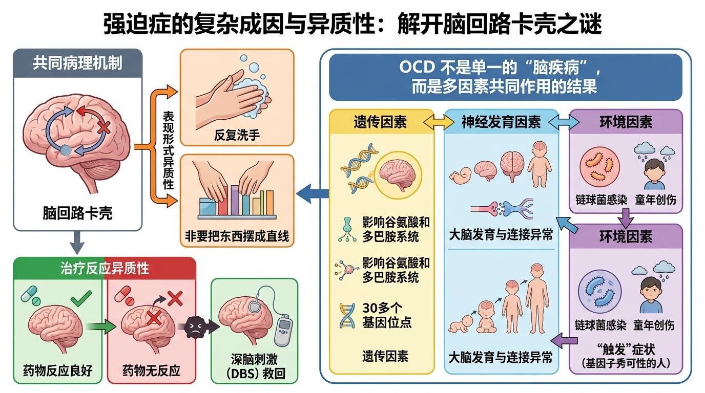 但拉波波特的研究也留下了未竟的谜题。比如为什么同样是脑回路卡壳,有的人反复洗手,有的人非要把东西摆成直线?为什么有些患者对药物完全没反应,却能被深脑刺激(DBS)救回来?这些问题指向了强迫症的复杂性:它不是单一的“脑疾病”,而是遗传、神经发育、环境创伤共同作用的结果。最新的基因组研究发现,强迫症和30多个基因位点相关,这些基因影响着大脑里的谷氨酸和多巴胺系统,而链球菌感染、童年创伤等环境因素,可能会在遗传易感者身上“触发”症状。