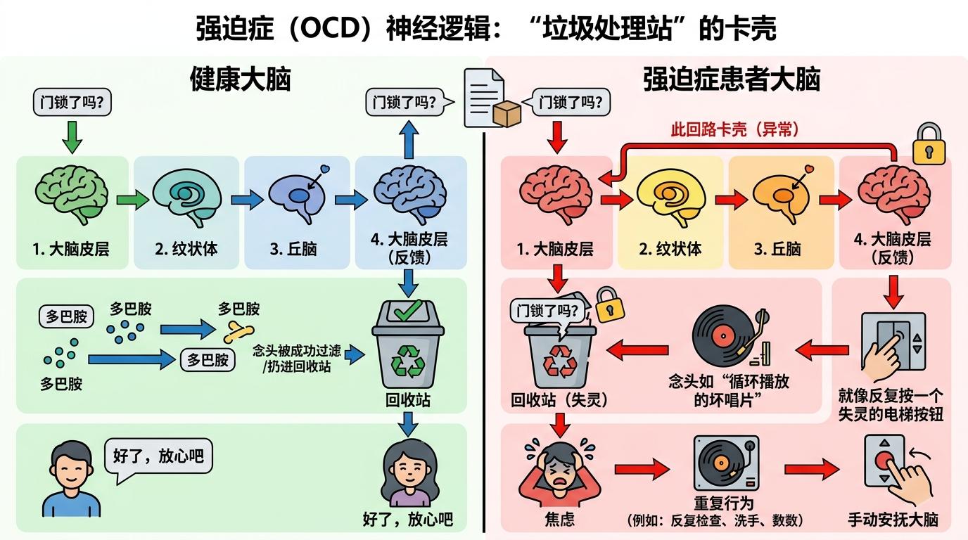 她用一个简单的类比解释了强迫症的神经逻辑:大脑里有个“垃圾处理站”——皮层-纹状体-丘脑-皮层回路,负责过滤不必要的焦虑信号。比如你锁完门,这个回路会说“好了,放心吧”,然后把“门锁了吗”这个念头扔进回收站。但强迫症患者的这个回路卡壳了,回收站的门永远关不上,那个念头就像循环播放的坏唱片,一遍一遍撞进脑子里。为了缓解这种焦虑,患者只能用重复行为“手动安抚”大脑——就像反复按一个失灵的电梯按钮。