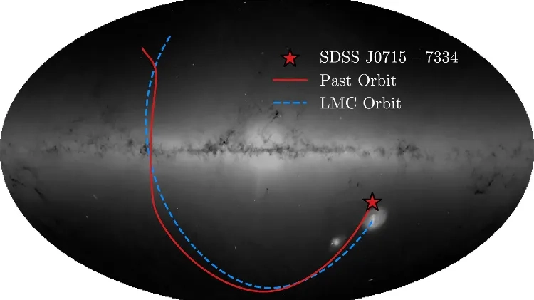如果说金属丰度是恒星的“出生证明”,那么欧洲空间局盖亚卫星的高精度数据,就是它的“迁徙路线图”。研究团队把这颗恒星的位置、距离和运动速度输入模型,倒推它数十亿年的轨道,结果指向了一个意外的源头:大麦哲伦星云——银河系最大的伴星系。