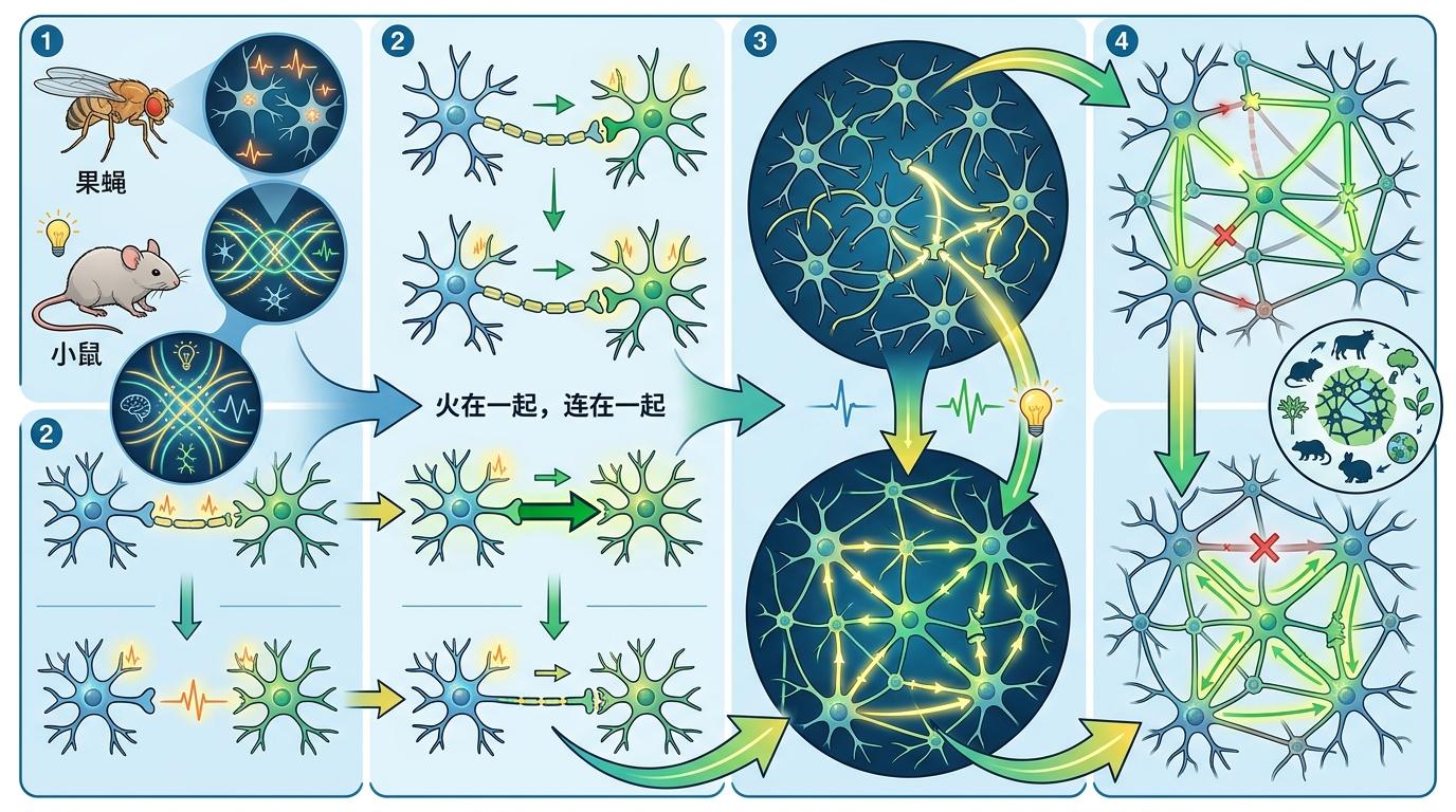 这不是空穴来风。芝加哥大学联合哈佛、耶鲁的研究发现,从果蝇到小鼠,不同物种的神经连接都遵循同一个自组织原则:神经元会根据「同时激活则连接增强」的规则,自发形成网络,而这个过程不需要任何外部「编程」。更有意思的是,网络中的随机性反而让大脑更稳定——就像生态系统里的物种多样性,单一连接的失效不会导致整个系统崩溃。