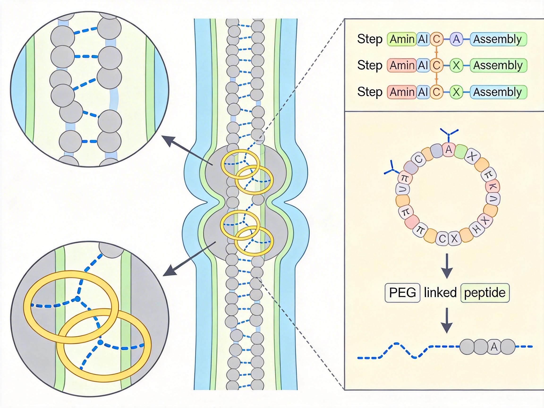 但真实的机制比这更复杂:肽与受体的结合不是简单的“插入锁孔”,而是涉及多个氨基酸残基的氢键、疏水作用和π-π堆积。科学家通过固相肽合成技术,能像搭积木一样逐个拼接氨基酸,定制出具有特定功能的肽链;再通过环化、PEG修饰等手段,解决肽类易被酶降解、膜穿透性差的问题。