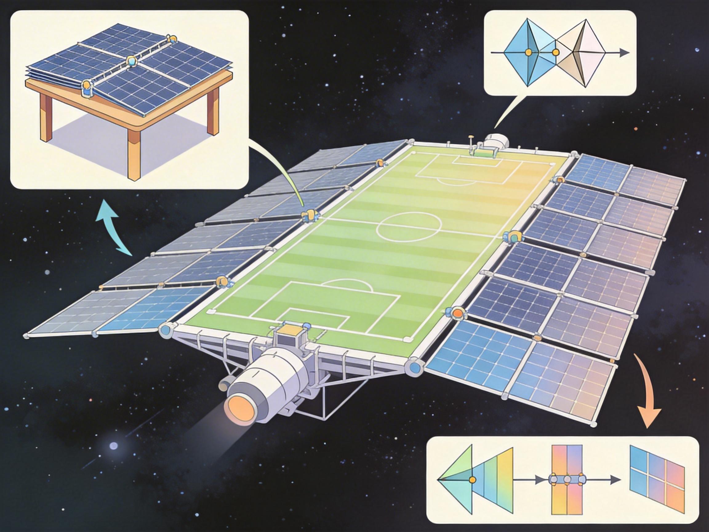 先聚焦那个把餐桌变足球场的技术——可部署式卫星太阳能阵列。简单说,就是发射时把太阳能板折叠成餐桌大小,入轨后通过折纸几何结构和同步展开机制,拉伸到足球场规模。这个技术的核心突破,是把卫星的可用功率提升10倍的同时,把成本砍去88%——要知道传统同步轨道卫星的太阳能阵列功率普遍在20-30kW,而它能轻松推到200kW以上。更关键的是,它解决了太空产业最棘手的矛盾:要大功率就得大体积,大体积就意味着发射成本飙升,而现在,这个死结被解开了。