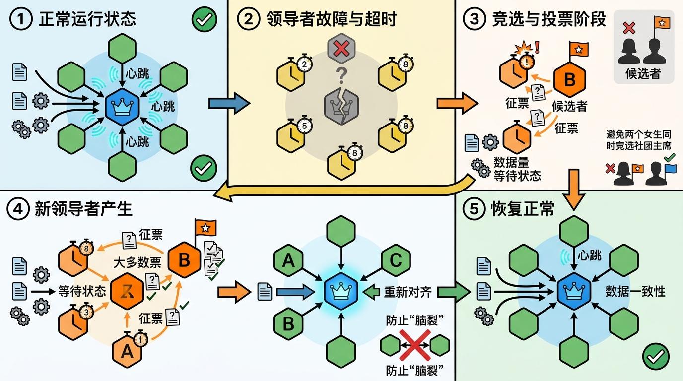 但女王蜂不是永远稳坐宝座。如果蕾吉娜突然缺席,剩下的成员会立刻开始新的“选举”——就像Raft里的节点在超时未收到领导者心跳时,会转为候选者发起投票。每个节点的选举超时时间是随机的,这能避免大家同时抢着当领导者导致选票分裂,就像不会有两个女生同时站起来竞选社团主席。一旦新领导者选出,所有新的数据请求都会转向它,确保集群始终有唯一的协调者,不会出现“脑裂”式的混乱。