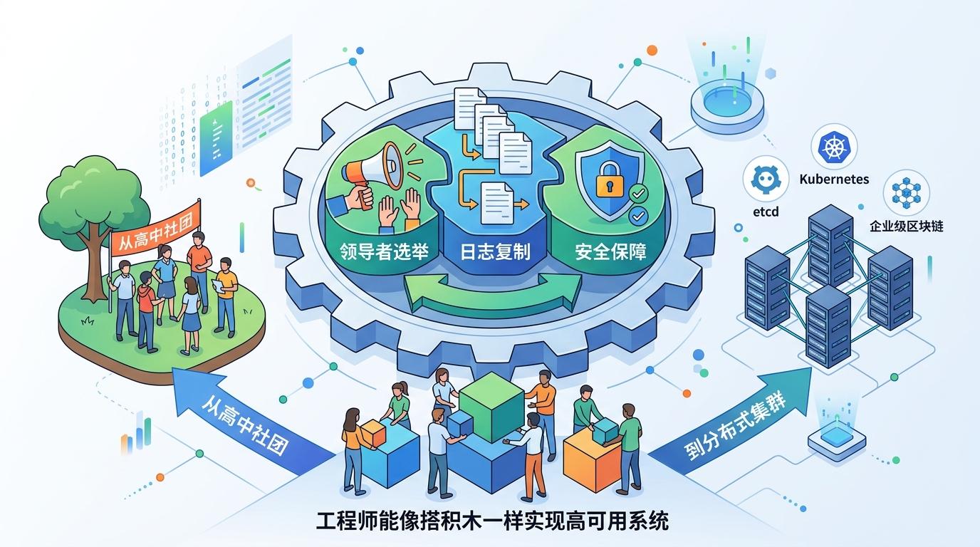 如今Raft已经成为etcd、Kubernetes这些云原生系统的核心,甚至走进了企业级区块链的场景。它的成功,本质是把复杂的分布式问题拆成了领导者选举、日志复制、安全保障三个清晰的模块,让工程师能像搭积木一样实现高可用系统。从高中社团到分布式集群,这个类比的真正价值,从来不是把技术变幼稚,而是让我们看清:所有复杂系统的底层,都藏着最简单的协作逻辑。