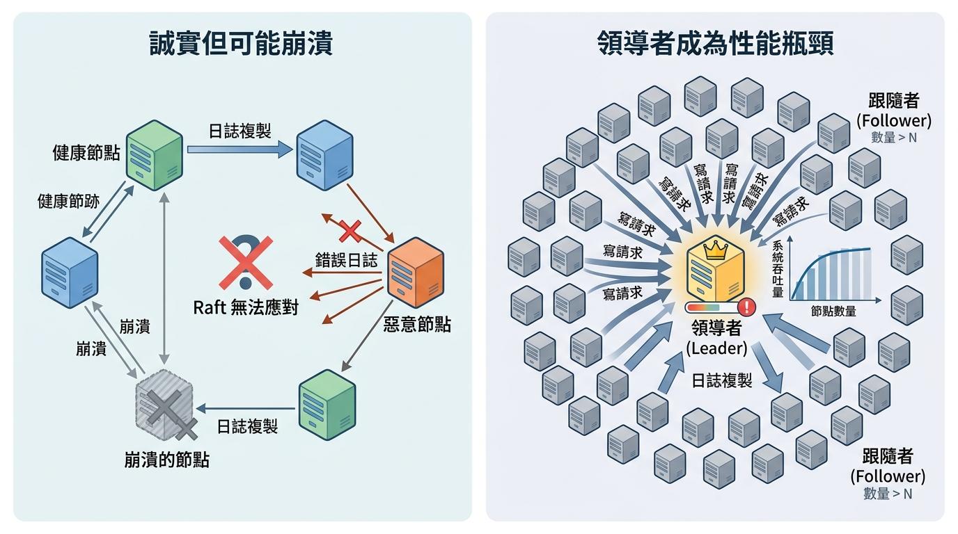 不过这套看起来完美的逻辑,也有它的局限。Raft假设所有节点都是“诚实但可能崩溃”的,就像高中里的学生只会请假不会故意撒谎——如果出现恶意节点伪造消息,它完全无力应对。而且所有写请求都要经过领导者,当集群规模扩大到几十甚至上百个节点时,领导者会成为性能瓶颈,就像一个要照顾几十人的班长,迟早会忙不过来。