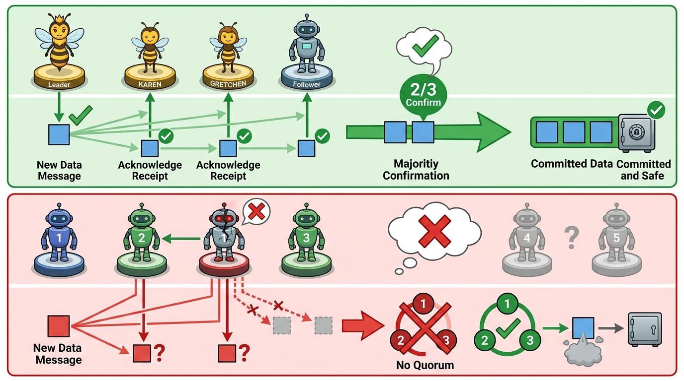 Raft算法的核心,是让分布式集群里的多个节点达成数据共识——就像塑料姐妹花共享秘密,不会因为其中一个人缺席,就让重要信息石沉大海。集群里必须有一个领导者,对应电影里的女王蜂蕾吉娜,她负责把所有新消息同步给其他节点,也就是卡伦和 Gretchen。只有当多数节点确认收到消息,这条数据才算真正“落地”,不会因为某台机器崩溃就消失。这就是法定人数机制:3个节点里至少2个确认,5个节点里至少3个确认,用多数派的存在,抵消少数故障的风险。