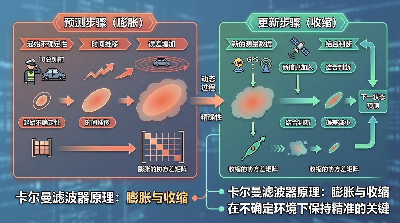 在预测步骤中,协方差矩阵会通过状态转移矩阵「膨胀」:随着时间推移,不确定性会越来越大,就像交警的预判过了10分钟,误差会变得更大。而在更新步骤中,新的测量数据会让协方差矩阵「收缩」——新信息的加入,让我们的判断更准确了。这种动态的膨胀和收缩,正是卡尔曼滤波器能在不确定环境下保持精准的关键。