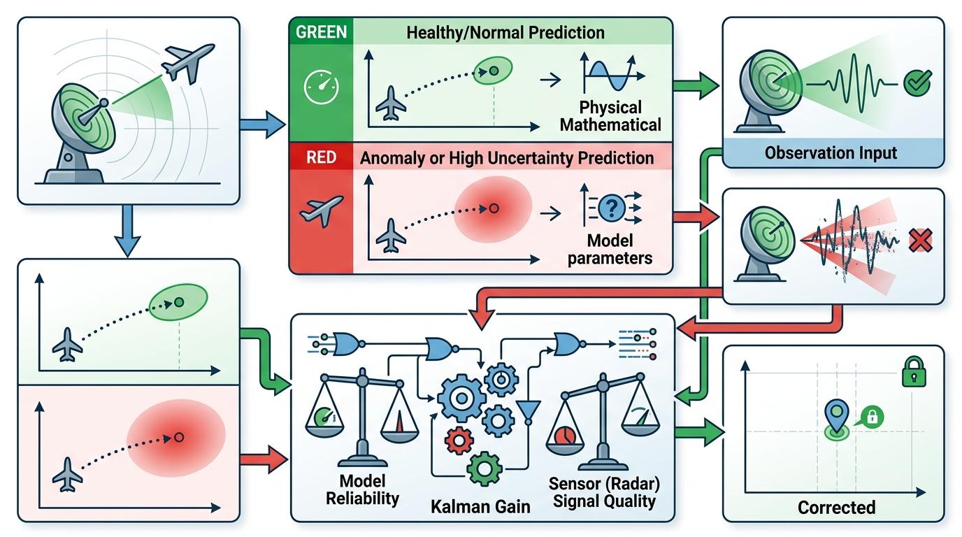 预测阶段,算法根据上一次的状态和物理模型,算出飞机下一秒应该在的位置,同时把不确定性也一起「推」到未来——就像交警根据车辆当前速度,预判它10秒后会到路口,但也知道可能有误差。更新阶段,新的雷达数据来了,算法会计算一个「卡尔曼增益」:如果雷达信号清晰(测量噪声小),就多信一点雷达;如果飞机的运动完全符合预判(模型可靠),就多信一点自己的预测。