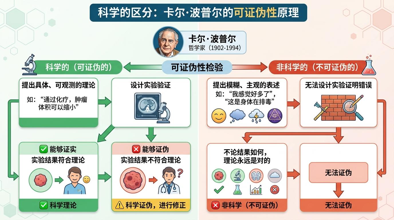 要理解这场争议的核心,得回到哲学家卡尔·波普尔提出的“可证伪性”——这是区分科学与非科学的黄金标准:一个理论或疗法只有能被设计实验证明“可能是错的”,才配得上科学的标签。比如“肿瘤缩小了”是可证伪的,做个影像检查就能验证;但“我感觉好多了”“这是身体在排毒”这类模糊表述,永远无法被证伪,也就不属于科学范畴。