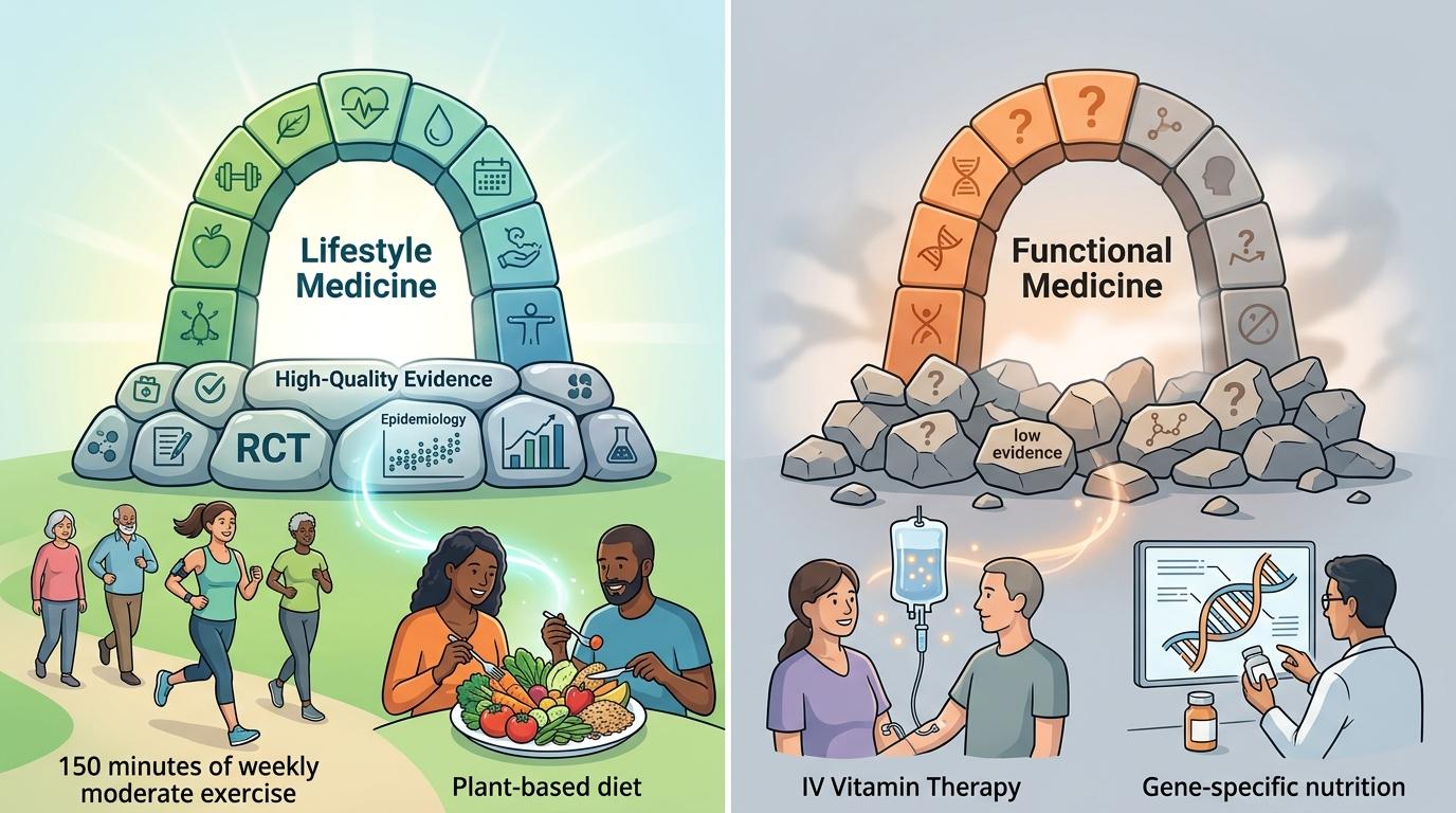 生活方式医学的核心部分,比如“每周150分钟中等强度运动降低死亡风险”“植物性饮食改善心血管健康”,已经有大量流行病学和随机对照试验(RCT)支持,甚至被美国医学会纳入官方认可范畴。但功能医学中更个体化的干预,比如针对特定基因的营养方案、IV维生素疗法等,却缺乏高质量的循证证据。